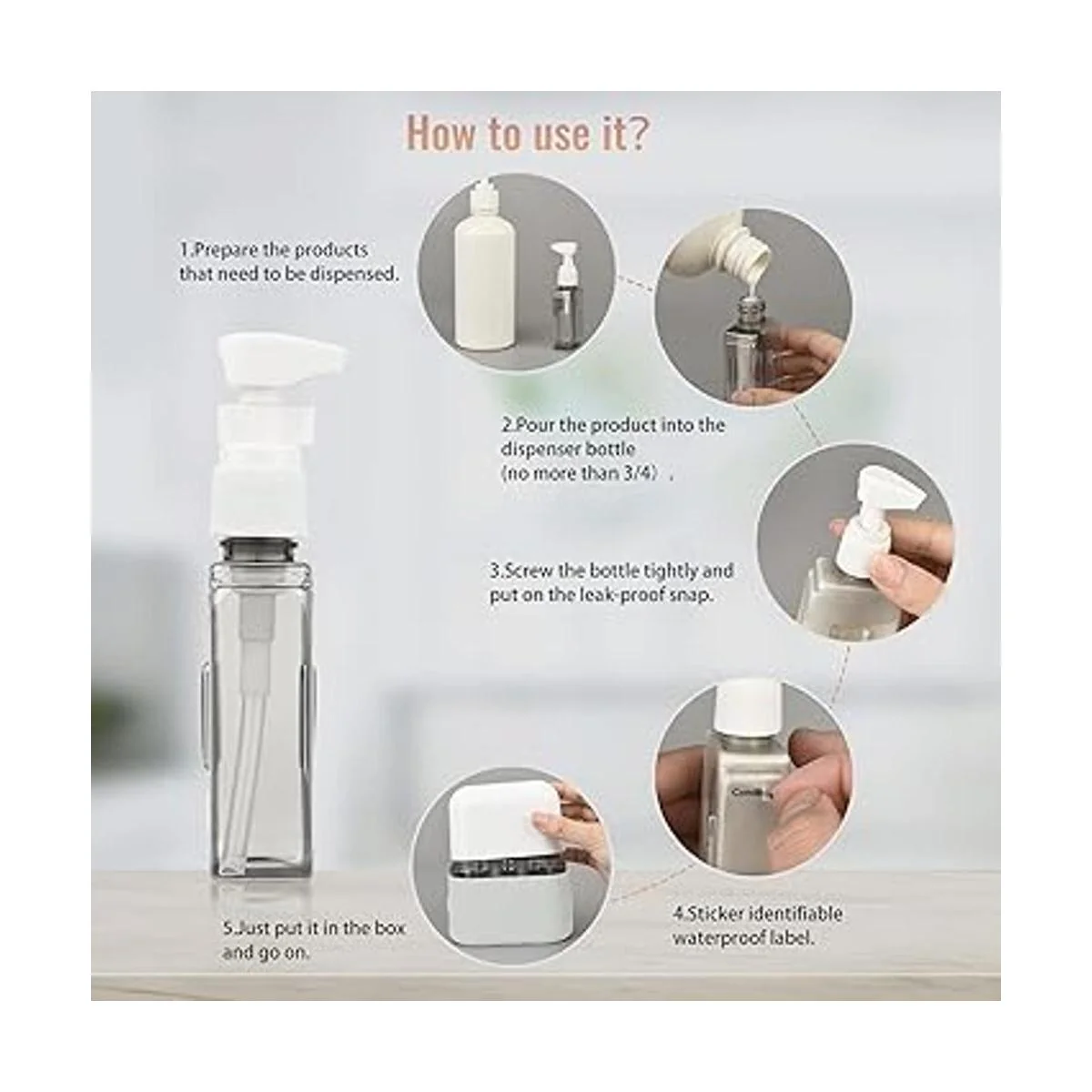 Diseño: botella transparente, tapa a prueba de polvo, hebilla a prueba de fugas, etiquetas pasables impermeables. Ahorro de espacio, sellado fuerte, no te preocupes por fugas incluso durante viajes con baches