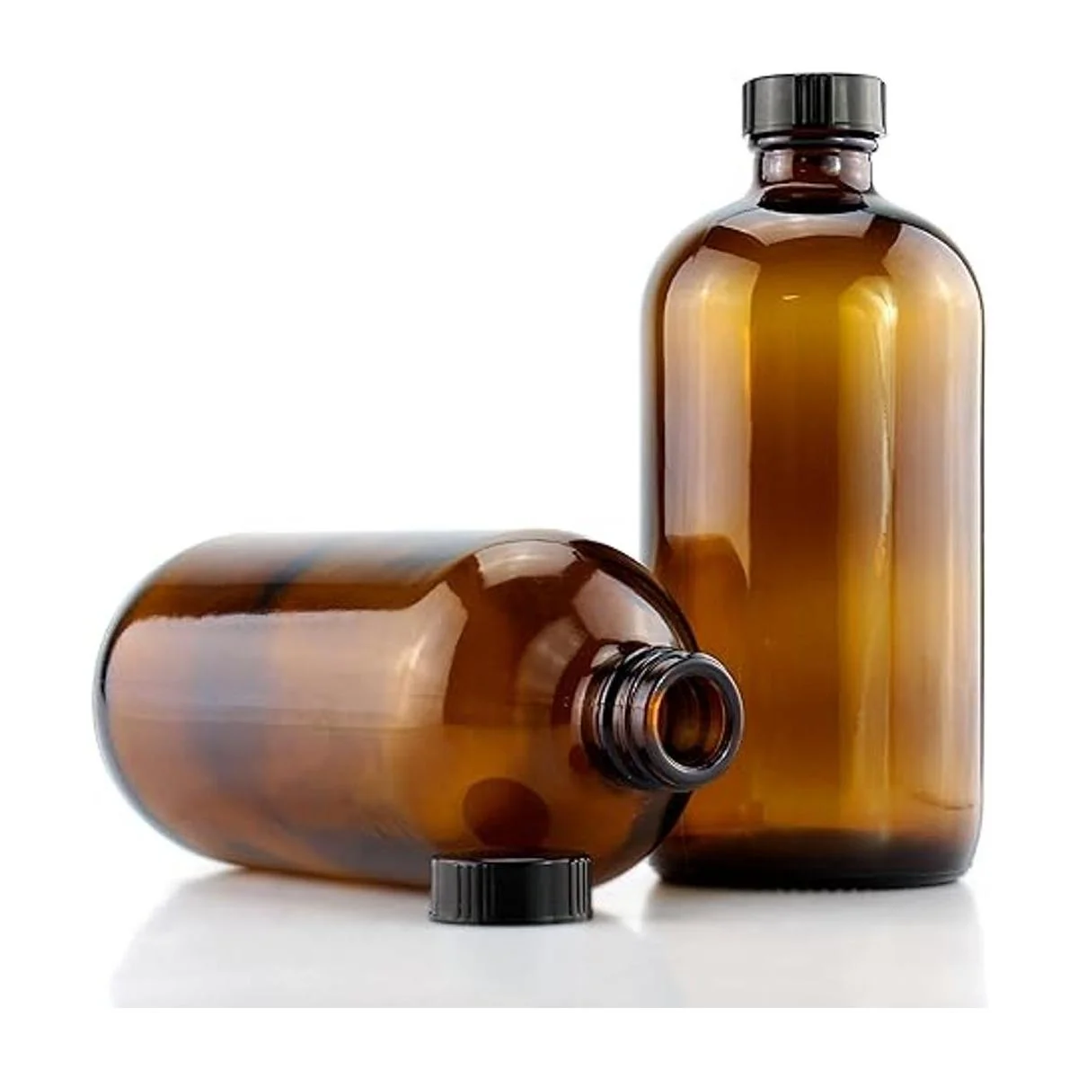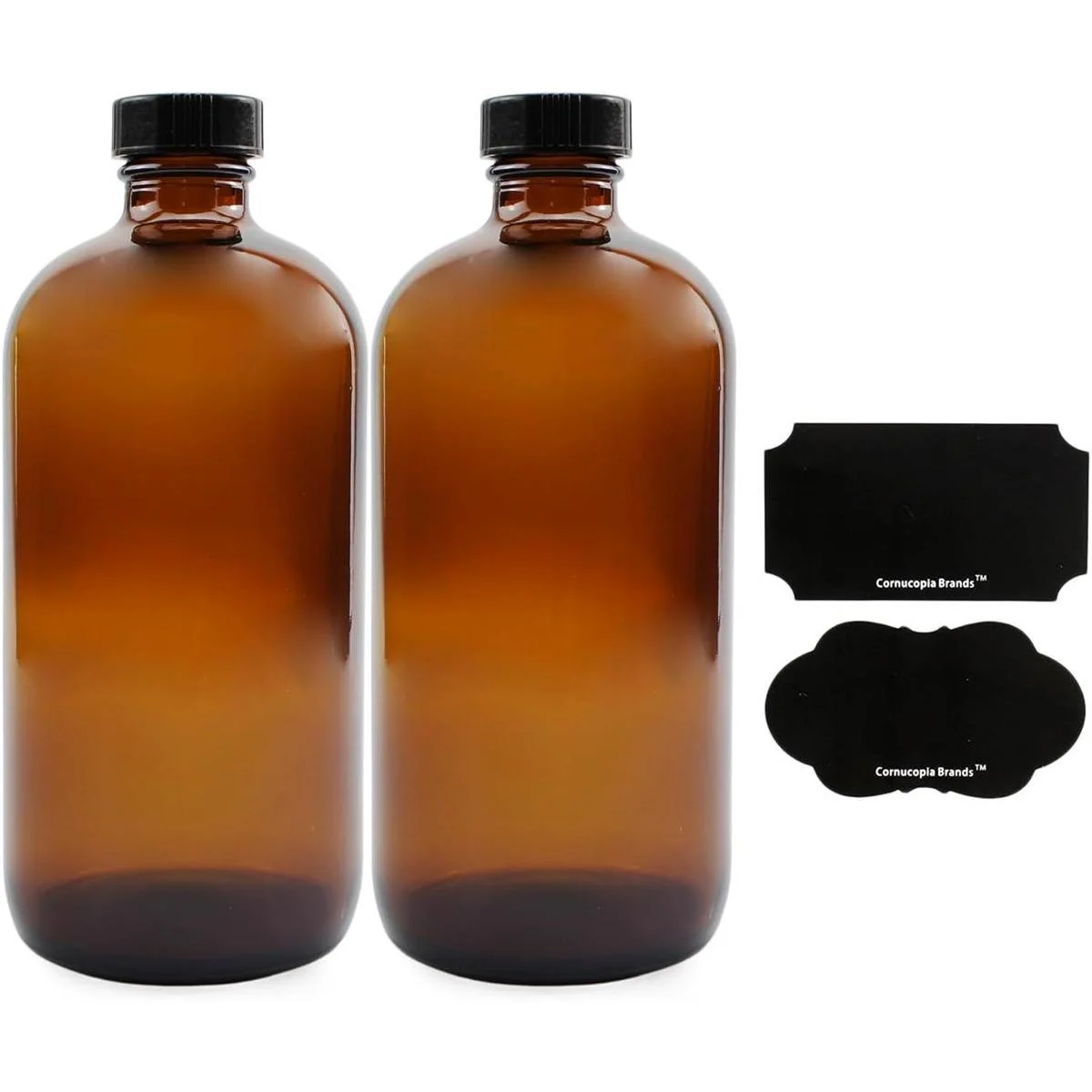 Botellas de vidrio ámbar de 16 onzas con etiquetas de tiza reutilizables y tapas paquete de 2, botellas redondas de Boston, color marrón recargable, con tapas negras de 28400 tapas