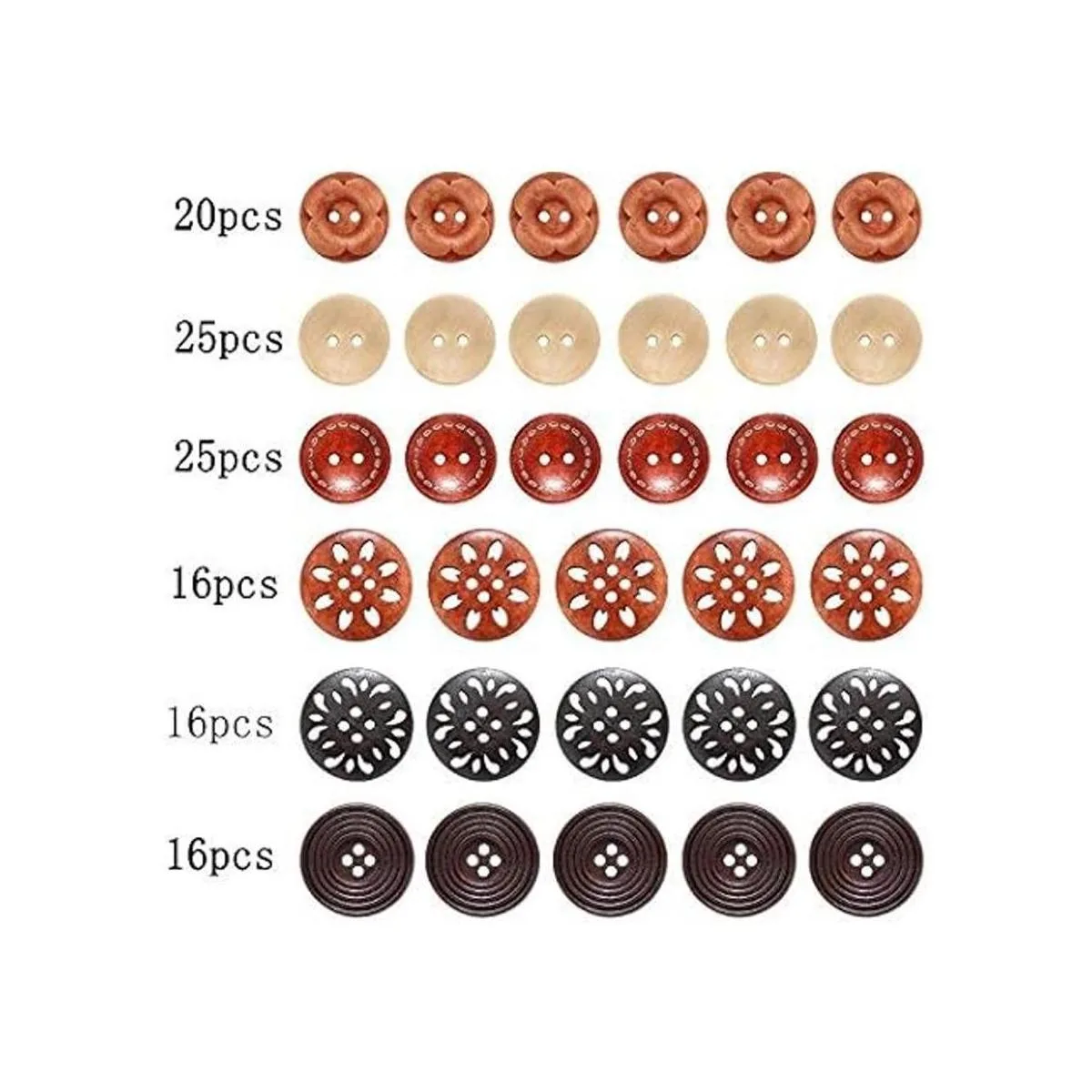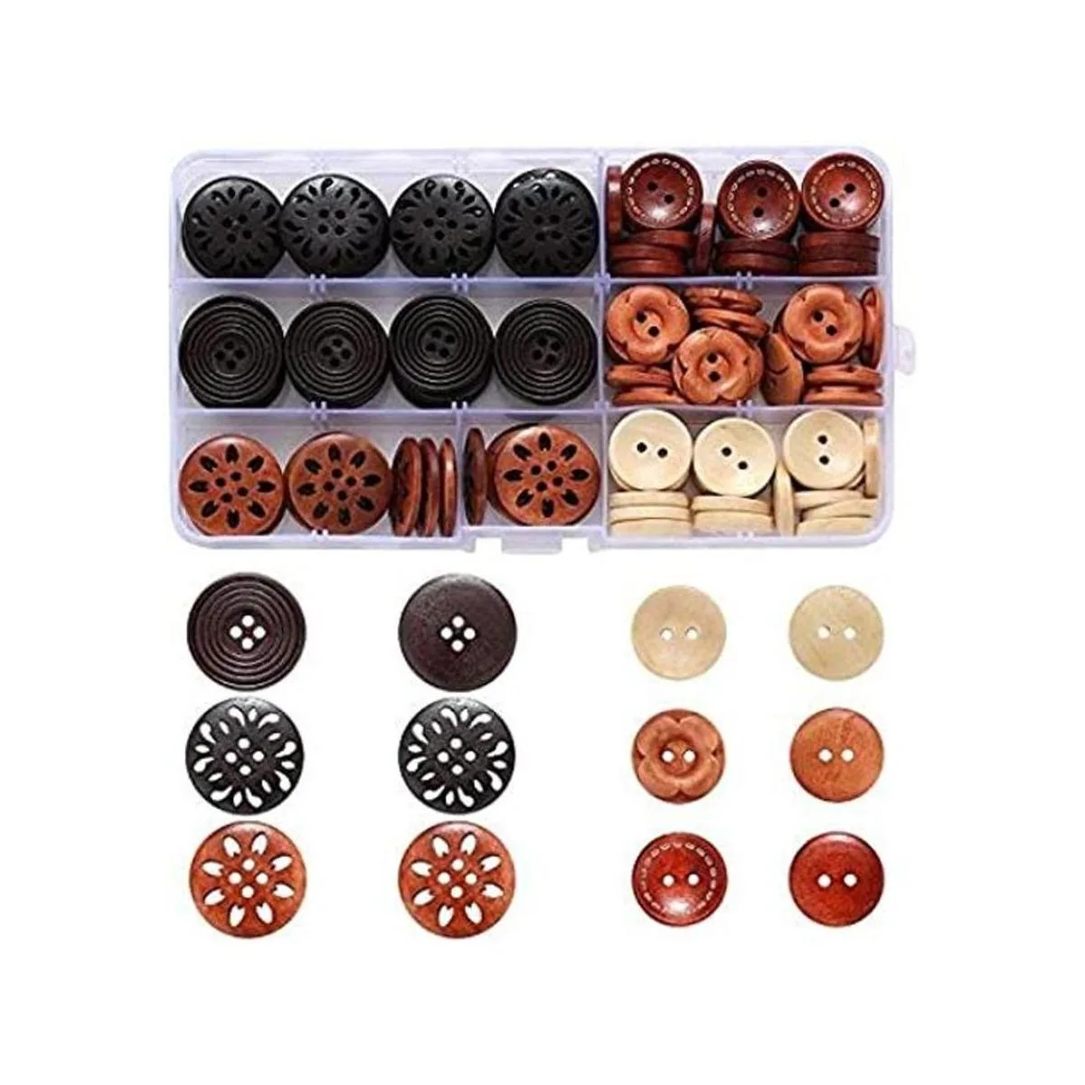 Botones de madera redondos surtidos, negro, marrón, beige, 4 agujeros, mixtos, manualidades, suministros con caja 118 unids