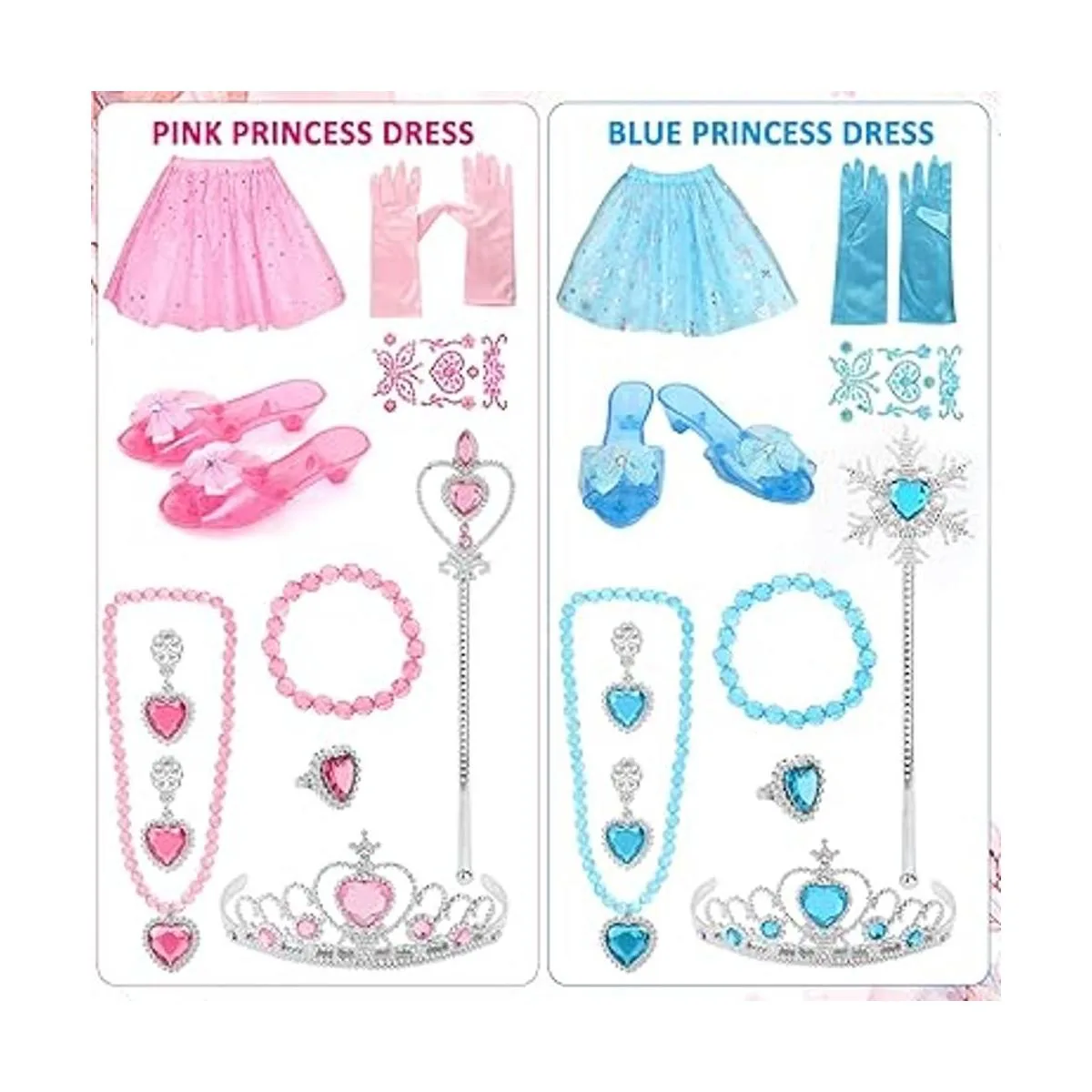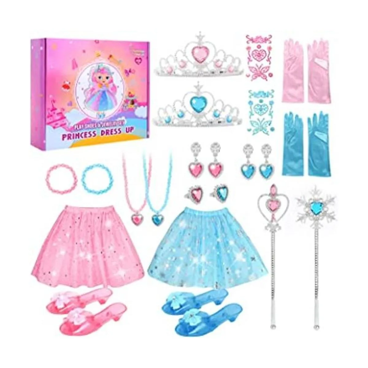 Disfraz de princesa: incluye 2 pares de zapatos de vestir de princesa, 2 faldas de princesa, 2 varitas mágicas, 2 guantes, 2 tiaras, 2 collares, 2 pulseras, 2 aretes, 2 anillos y 2 calcomanías, todos estos están empaquetados en una bonita caja rosa, que ayuda a las niñas a guardarlos ordenadamente.