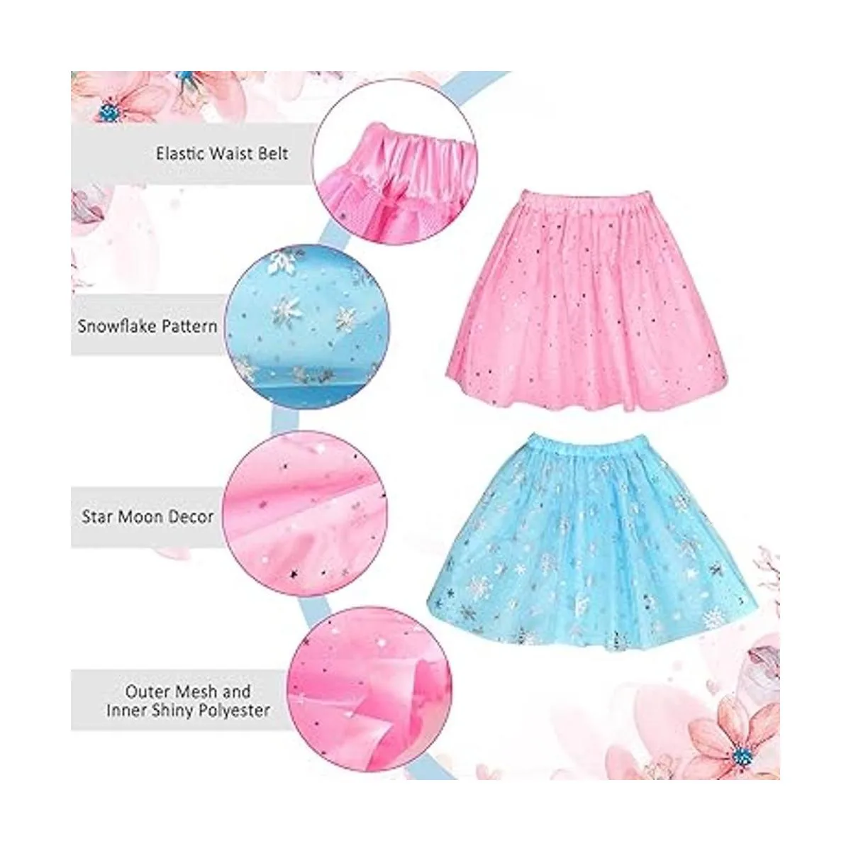 Juguetes de princesa de calidad: la falda de princesa con cintura elástica tiene un forro de poliéster y una capa exterior de tul que está cubierta por copos de nieve, estrellas, purpurina estampada de luna. 2 pares de zapatos anchos antideslizantes de princesa para niñas cuentan con decoración de lazo en diferentes colores. Se fija en el zapato cosiendo en comparación con pegar, por lo que es más seguro y cómodo.
