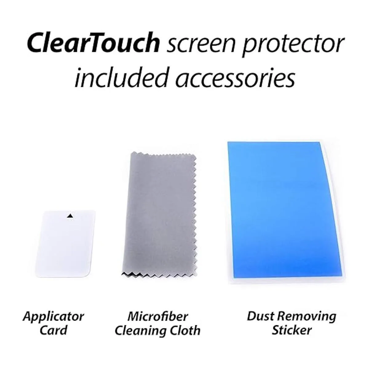 Cada paquete contiene 2 protectores de pantalla ClearTouch antirreflectantes, una tarjeta ClearTouch y un paño de limpieza de microfibra.
