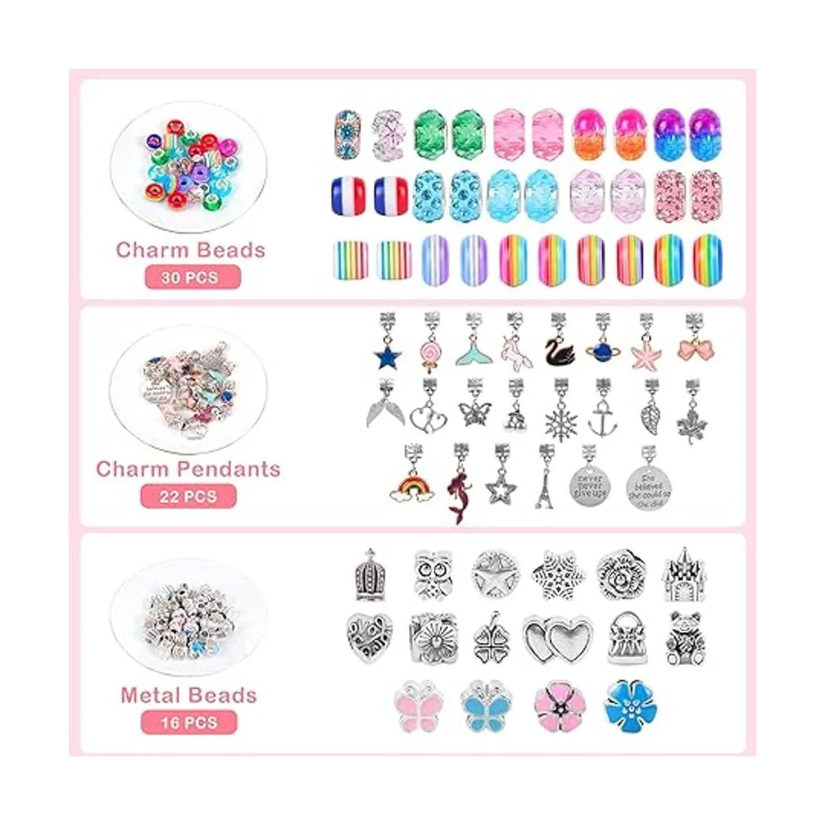 Gran valor incluido en el paquete: 30 cuentas 22 colgantes 16 cuentas de metal 3 pulseras de cadena de serpiente 3 collares rosa, azul, negro 1 caja de joyería rosa 1 caja de regalo rosa 1 manual de usuario incluyendo instrucciones y estilos de pulsera de muestra.