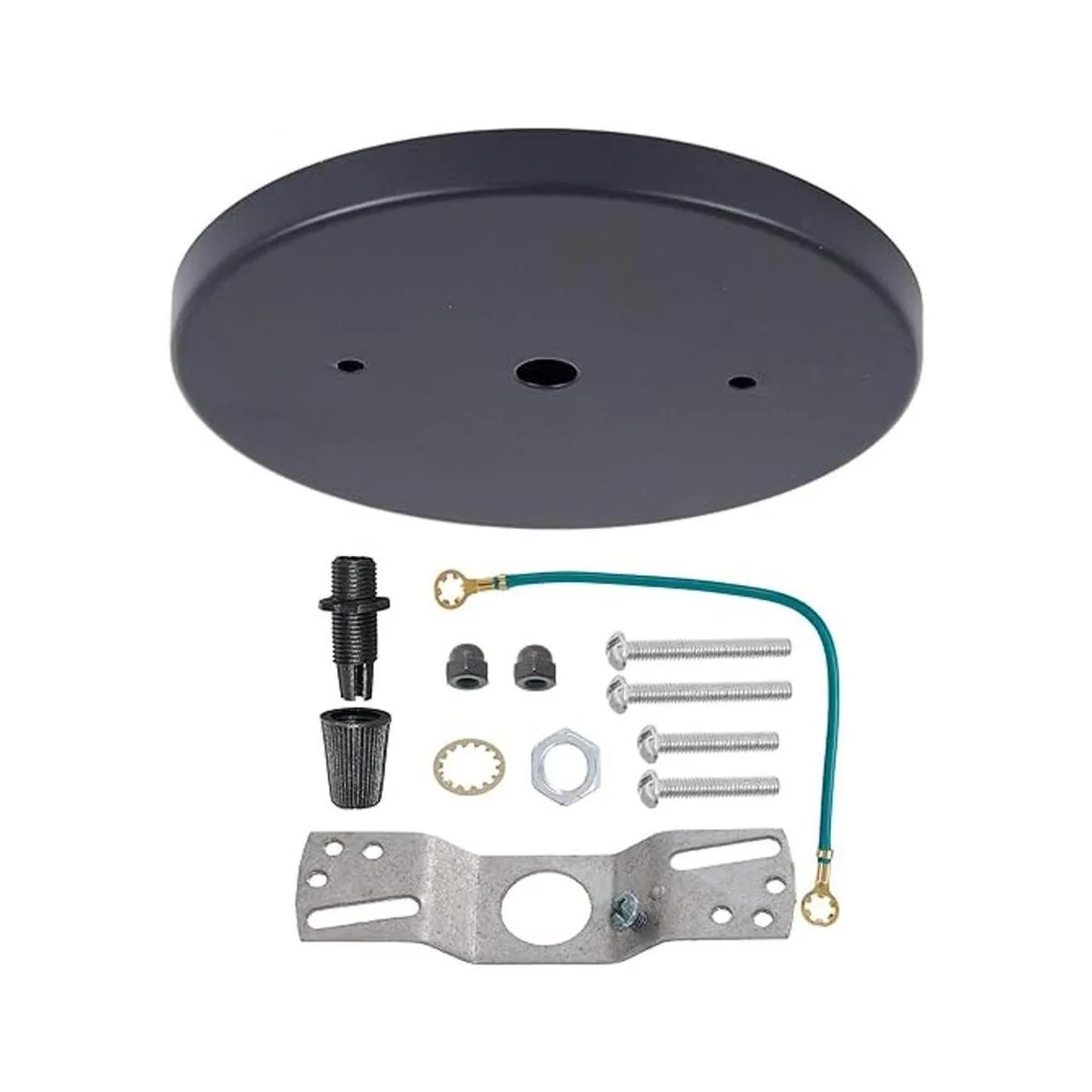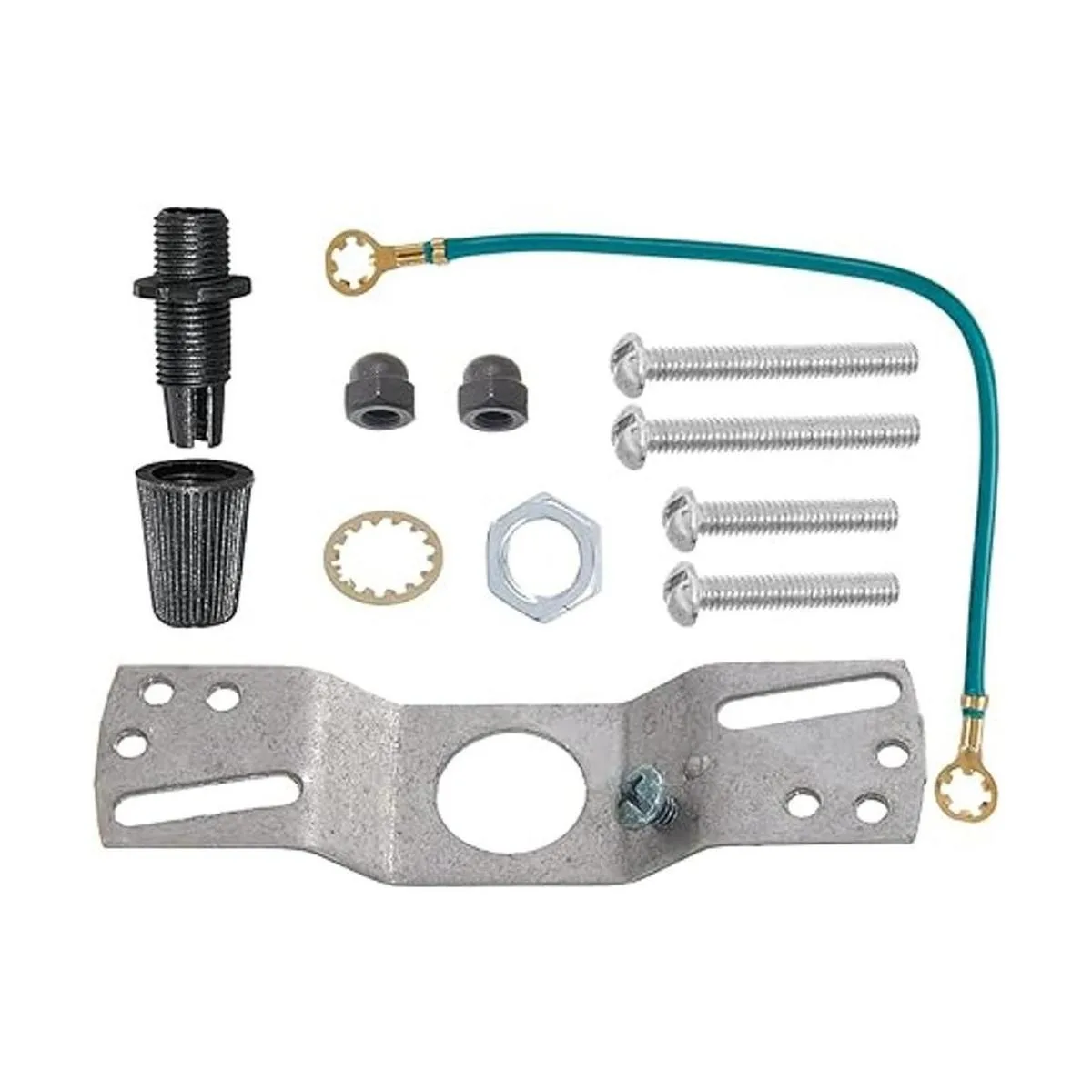 Includes 4 inch offset crossbar with ground screw, 6.75 inch long ground wire with 8 rings on each end, black cord grip busing, 2 pieces of 1.5 inch long 8/32 screws, 2 pieces of 1 inch long 8/32 screws and 2 matching color acorn cap nuts