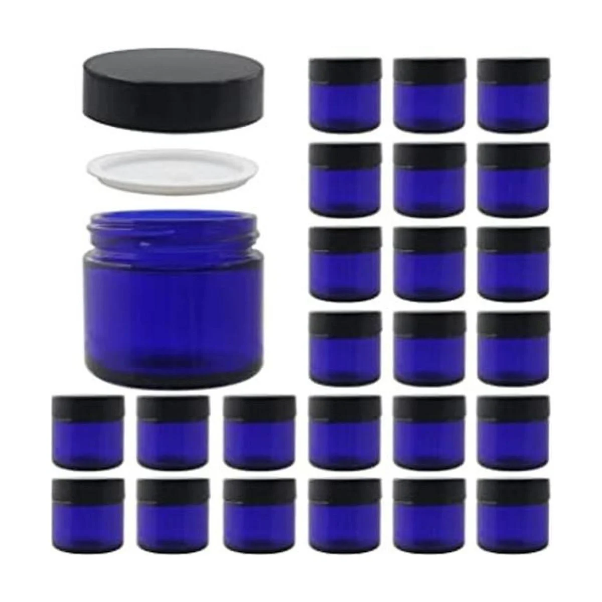 BPFY 24 frascos de cristal azul redondo de 1.7 fl oz con revestimientos interiores y tapas negras, frascos de viaje, envases recargables para maquillaje, crema, loción, exfoliantes de azúcar, sombra de ojos, limo, pintura, joyería