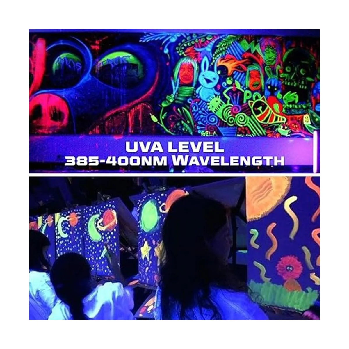 Bombillas de luz negra. Los rayos UV de las bombillas LED negras emiten un hermoso brillo de neón cuando se dirigen a ciertos objetos de colores, lo que las hace perfectas para efectos de iluminación decorativos y artísticos para crear un ambiente visualmente dramático.
