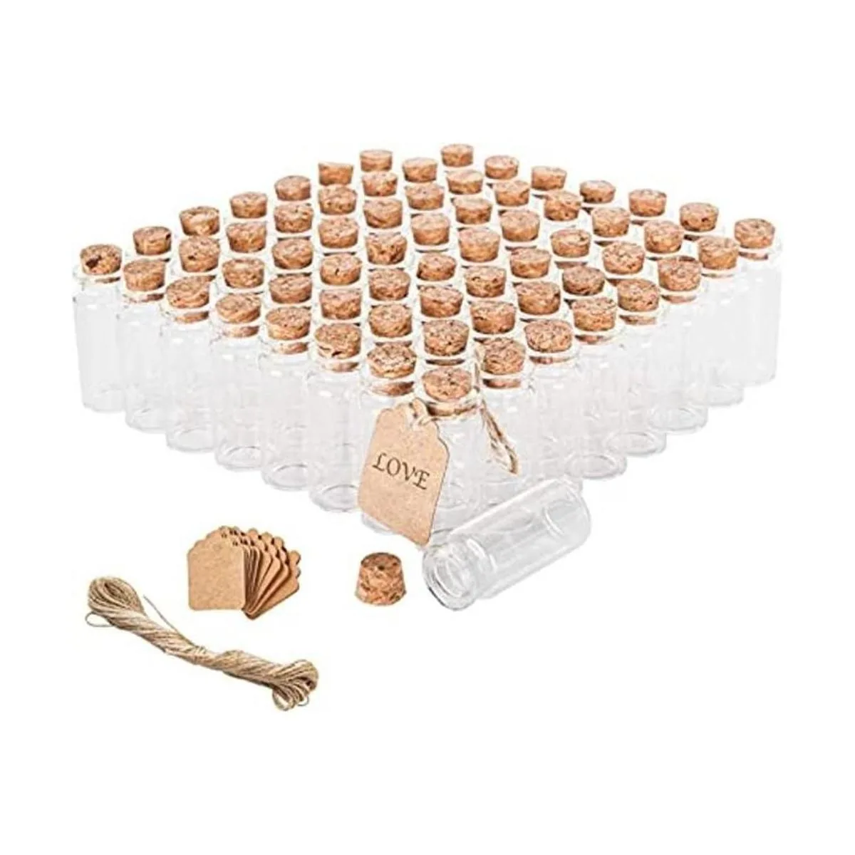 Juego de 64 biberones de cristal con tapas de corcho, etiquetas personalizadas y cuerda que se puede utilizar en variedad de estilos o diseños.