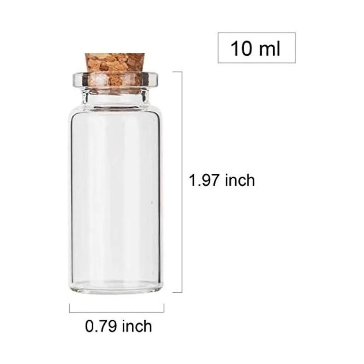 Capacidad de 0.3 fl oz. Altura de la botella sin corcho: 1.96 pulgadas, diámetro inferior: 0.86 pulgadas.