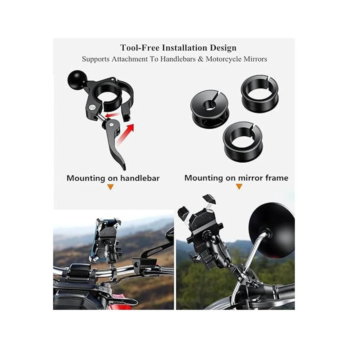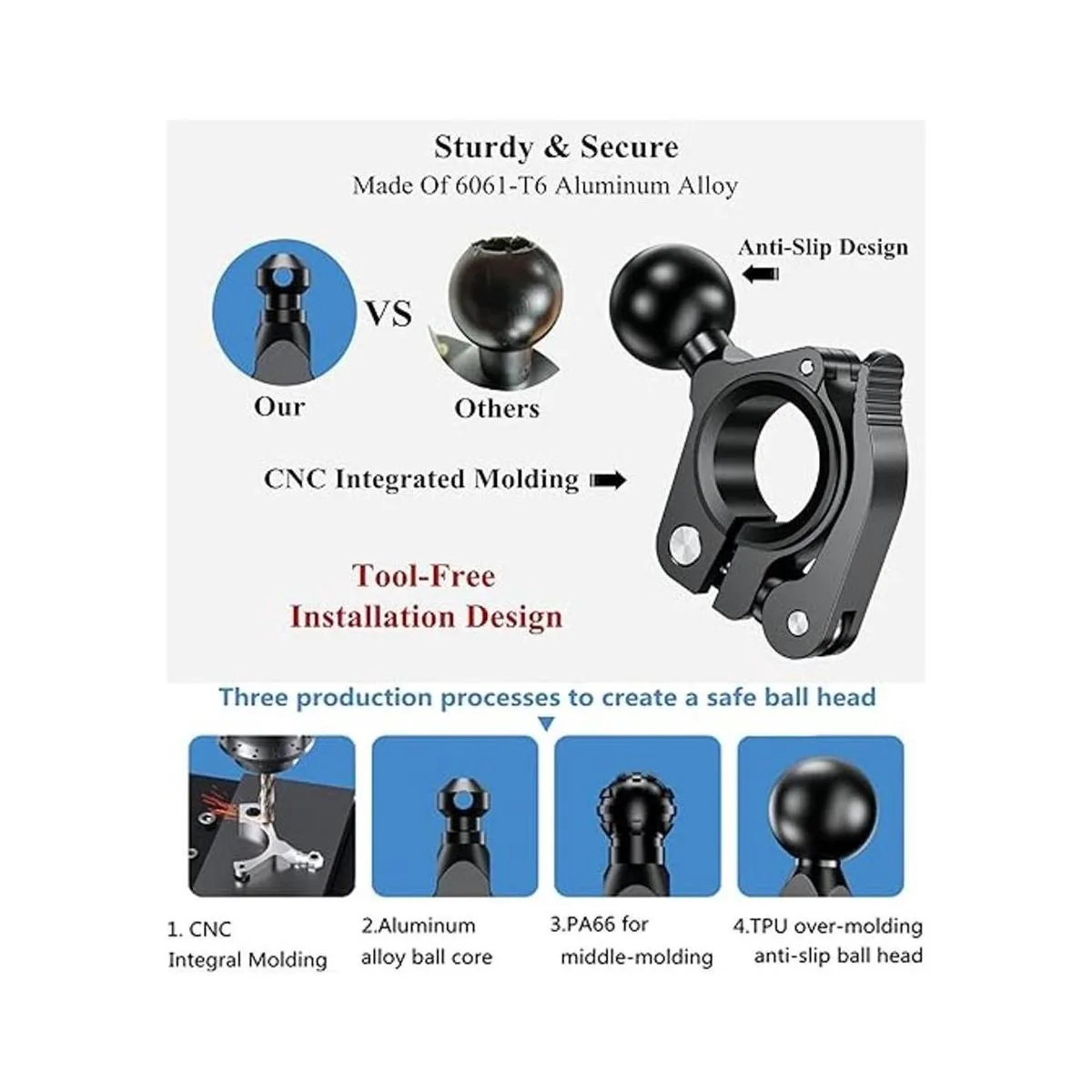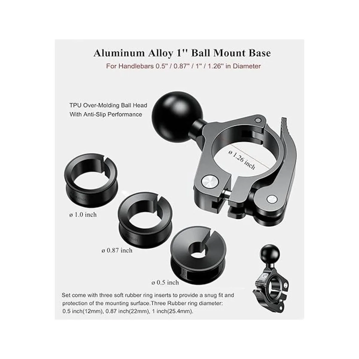 La base de montaje de bola de 1.000 in se adapta a manillares de 0.472 in de diámetro. Diseño de instalación sin herramientas. Soporta instalación y extracción rápidas.