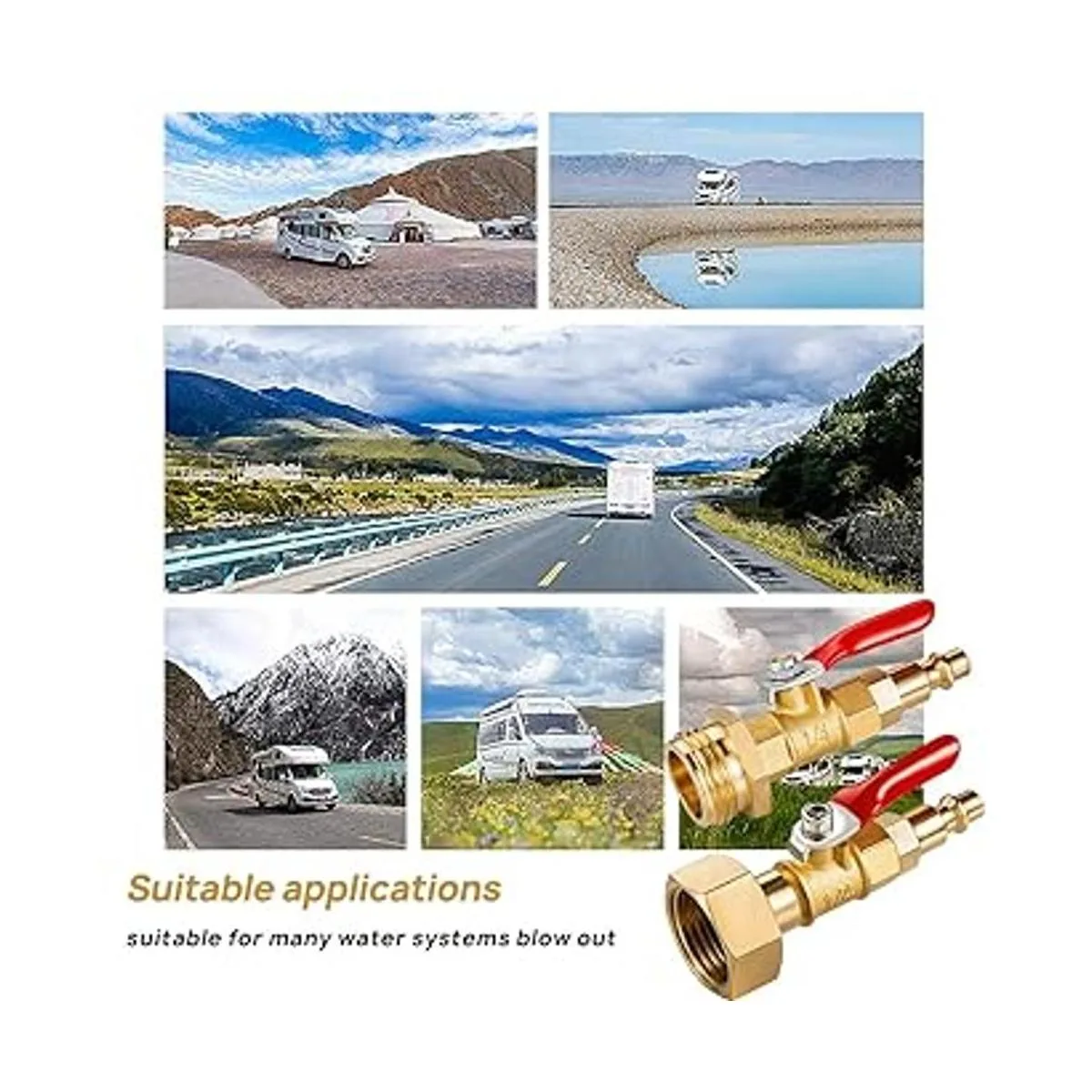 Amplia aplicación: por un lado, adecuado para la mayoría de sistemas de agua RV barco caravana remolque de viaje tales vehículos con sistema de suministro de agua. Por otro lado, utilízalo para soplar o invernar cualquier sistema de agua con una rosca macho de manguera de jardín, como manguera de jardín, grifos, sistemas de aspersor y líneas de agua al aire libre.