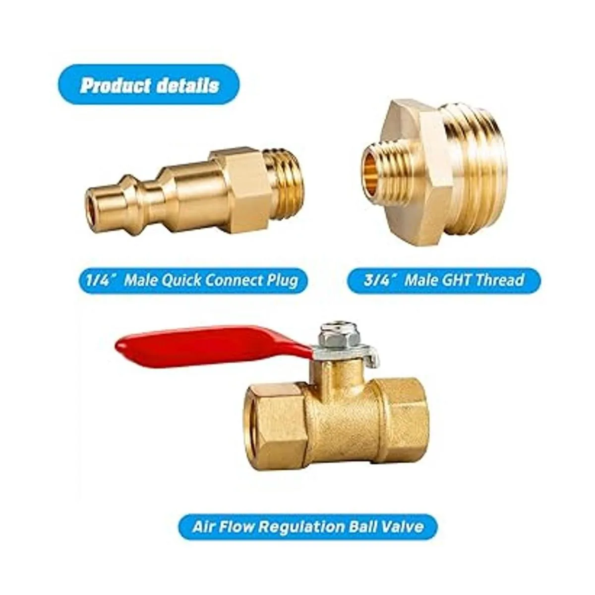 El paquete incluye: 2 adaptadores de latón para invierno, enchufe de conexión rápida macho de 1/4 pulgadas y rosca macho GHT de 3/4 pulgadas y válvula de bola de 1/4 pulgadas con 2 arandelas.