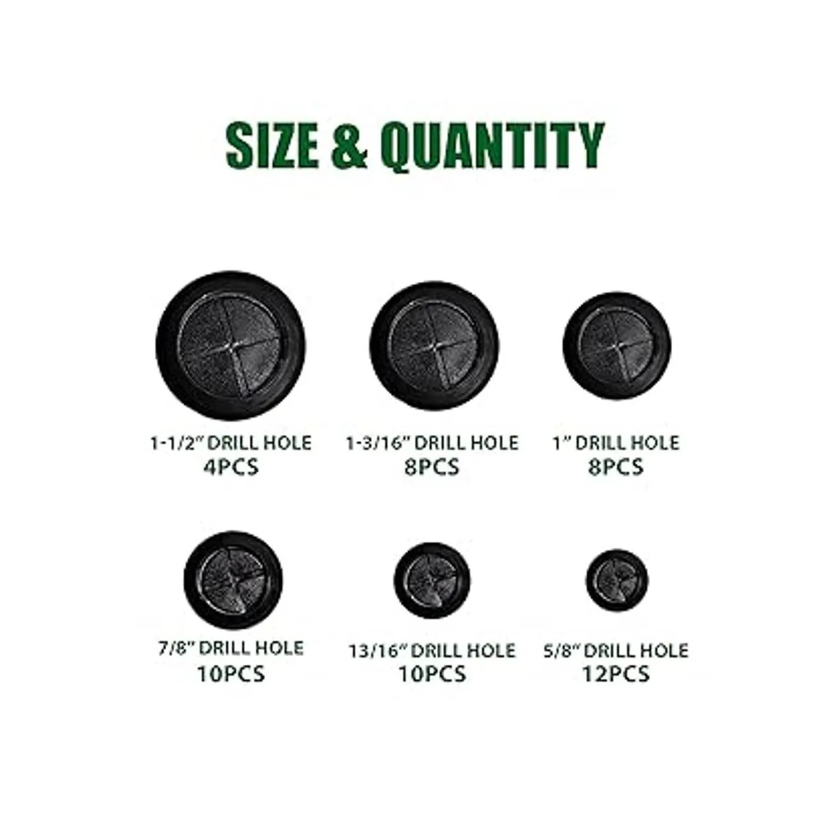 Gran variedad de tamaños: siempre no estás seguro de qué tamaño necesitas para tu proyecto No te preocupes, nuestro kit surtido de ojales de goma viene con 6 tamaños diferentes 52 piezas. No importa si planeas o no planeas, puedes encontrar los tapones de goma perfectos para agujeros en 6 tamaños diferentes aquí. El paquete incluye 12 piezas de 5/8 pulgadas, 10 piezas de 13/16 pulgadas, 10 piezas de 7/8 pulgadas, 8 piezas de 13/16 pulgadas y 4 agujeros de 11/2 pulgadas