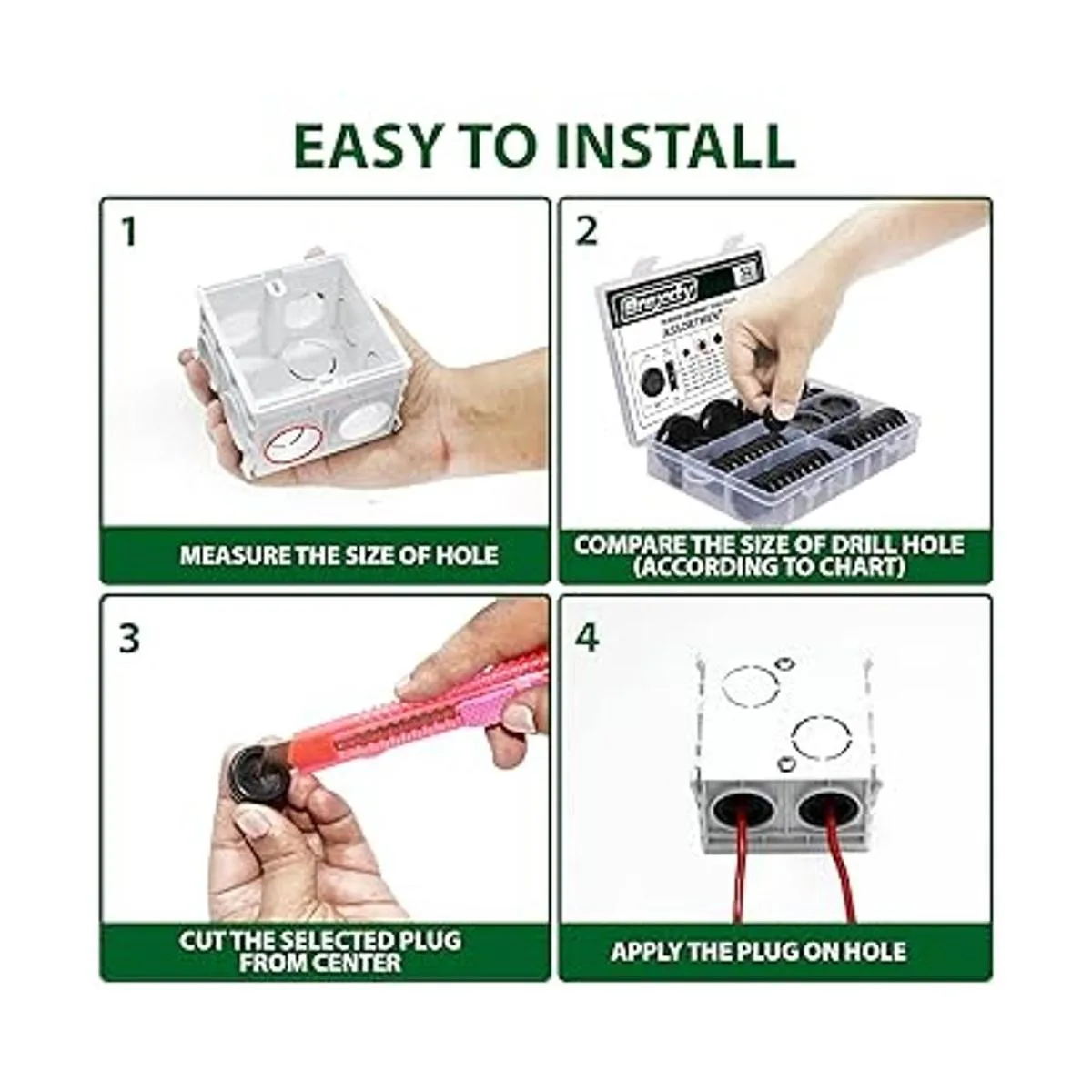 Embalaje práctico: estos ojales de alambre de goma vienen en una bandeja seccionada muy práctica con compartimentos de tamaño separado que hacen que sea fácil encontrar el tamaño que necesitas. Ahorrarás mucho tiempo buscando y averiguando el tamaño correcto del enchufe de cortafuegos para tus necesidades. La bandeja seccionada viene con una tabla de tallas detallada que te dará una idea completa sobre el tamaño del agujero del taladro para que puedas usarla de acuerdo a tus necesidades