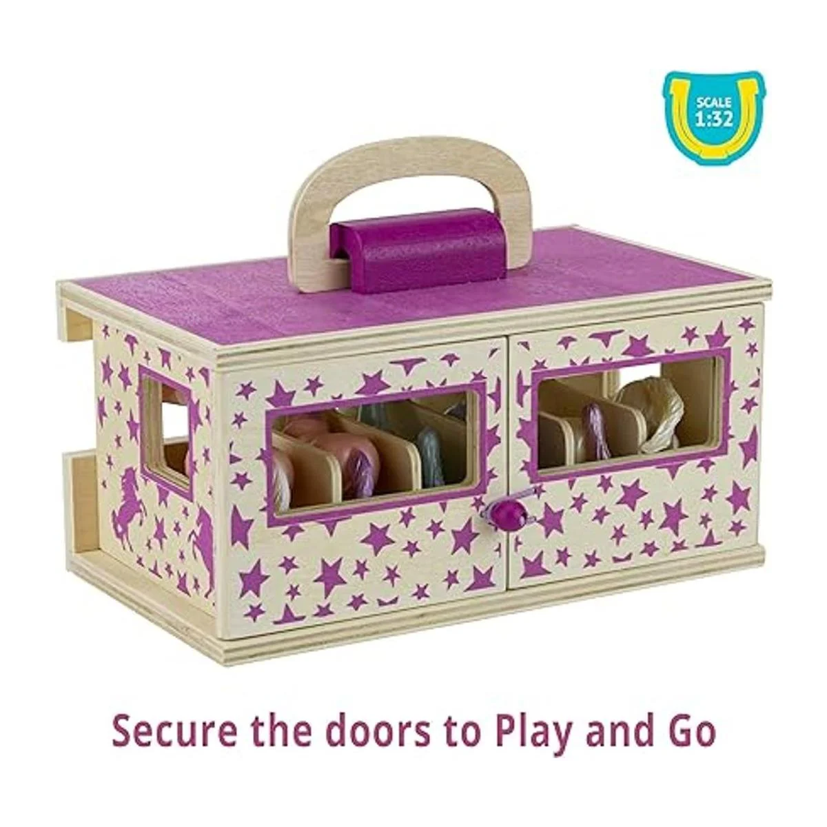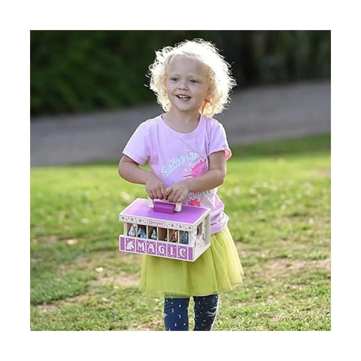 Juego de 6 unicornios: la funda de transporte estable de madera mágica de unicornio Breyer Farms es un estable de madera de alta calidad que viene completo con 6 unicornios de Stablemates. Diseñado para ser fácil de llevar para las manos pequeñas, la funda de transporte de madera es el juguete perfecto para llevar