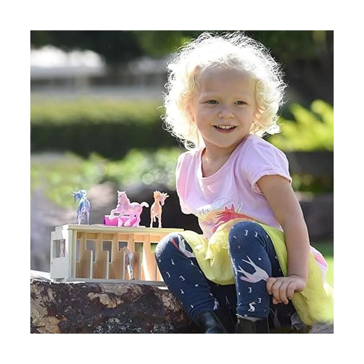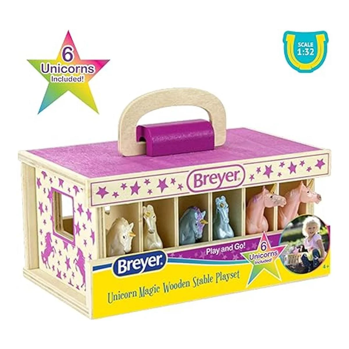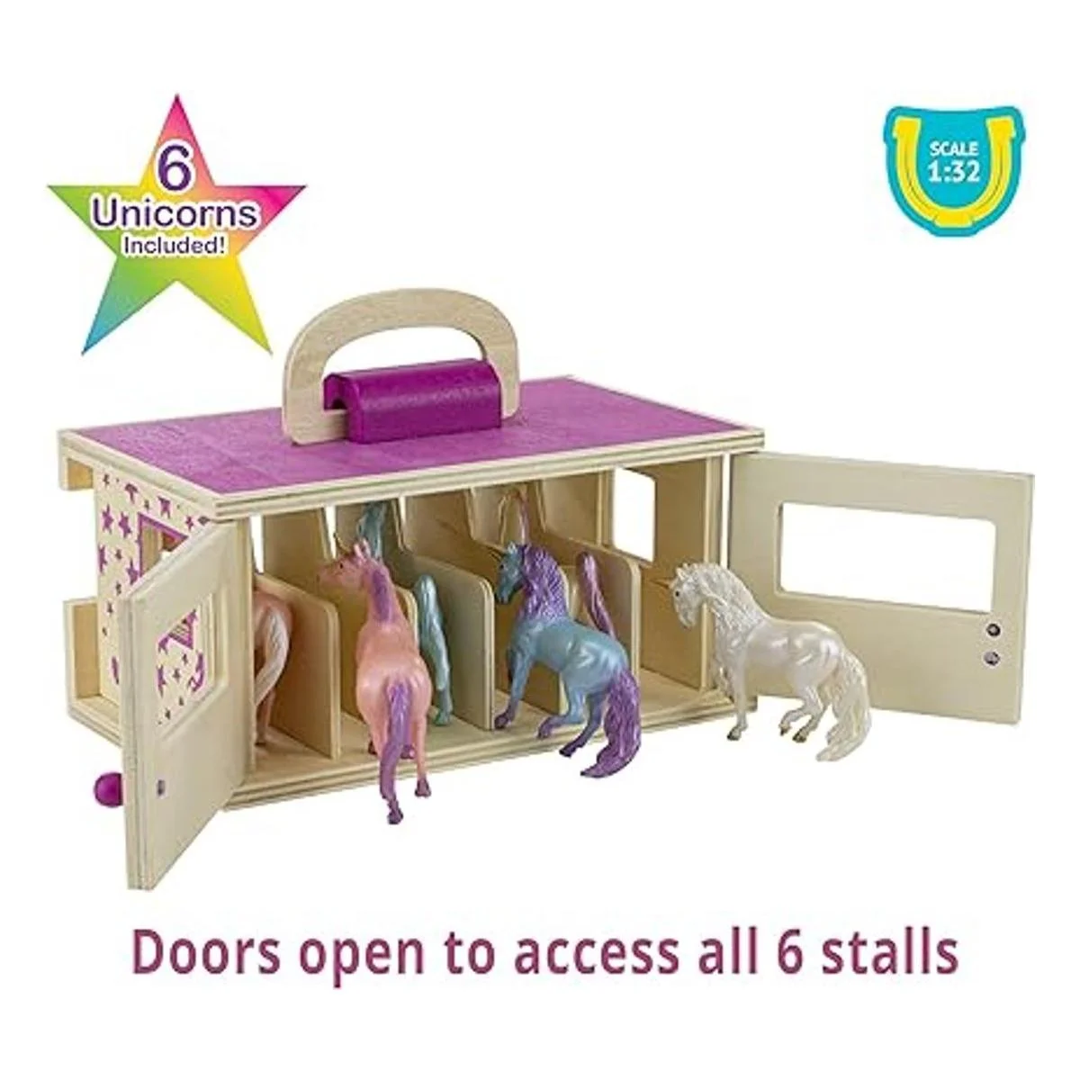 Breyer Caballos unicornio mágico juego estable de madera con 6 unicornios | Juego de 6 piezas | 6 uniformes incluidos, 6 pulgadas de alto x 9 pulgadas de largo x 2.5 pulgadas de profundidad | Escala 1:32 | Modelo #59218, multicolor