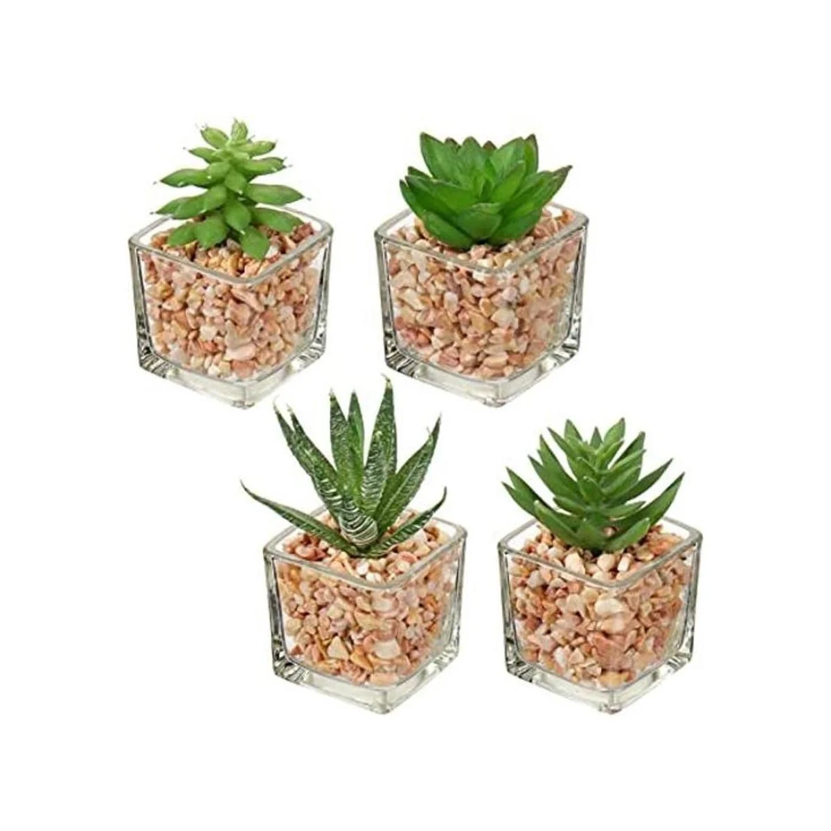Briful Suculentas falsas plantas artificiales en maceta cuadrada de vidrio de 2 pulgadas de alto, juego de 4 mini suculentas sintéticas en maceta para decoración de mesa de baño interior