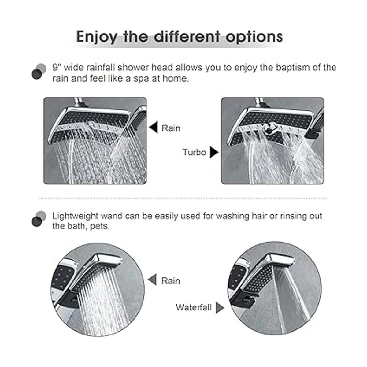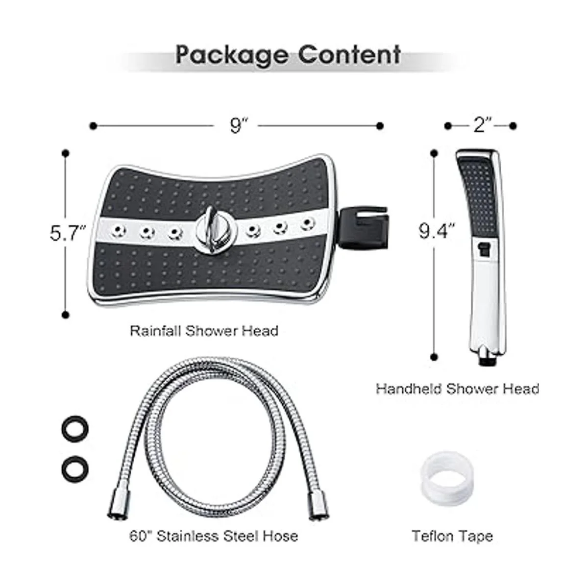El combo de cabezales de ducha de lluvia está empaquetado en una caja fuerte, perfecto como regalo para amigos. El paquete incluye: 1 cabezal de ducha de lluvia, 1 ducha de mano, 1 manguera de ducha de acero inoxidable de 60 pulgadas, 1 cinta de sellado de rosca de teflón. Ten en cuenta que las arandelas están premontadas