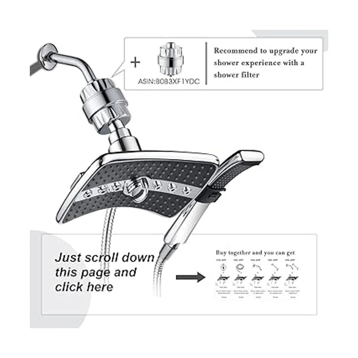 BRIGHT SHOWERS Combo de cabezal de ducha doble, juego de cabezal de ducha de mano con cara negra, manguera de ducha de acero inoxidable de 60 pulgadas de largo, cromado
