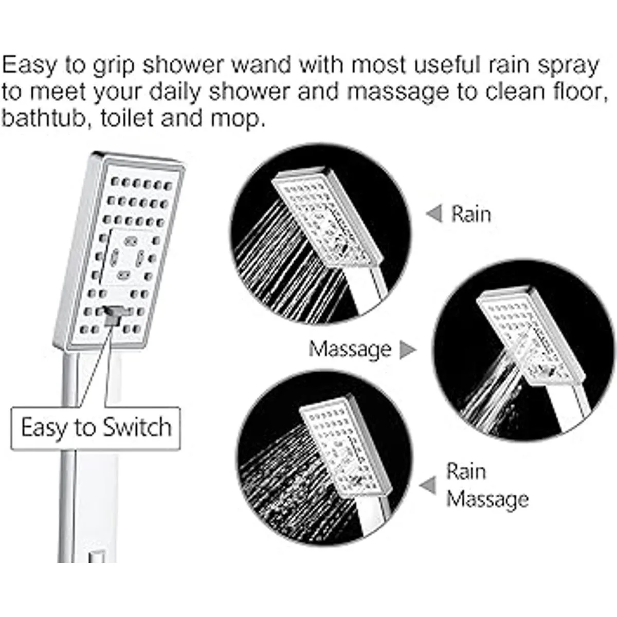 3 ajustes de pulverización multifuncionales: ajustes de pulverización ajustables, incluyendo spray de lluvia, masaje o combinación que cumple con tu spray de cuerpo completo, puedes cambiarlos rápidamente pulsando el botón en la cara frontal del cabezal de ducha