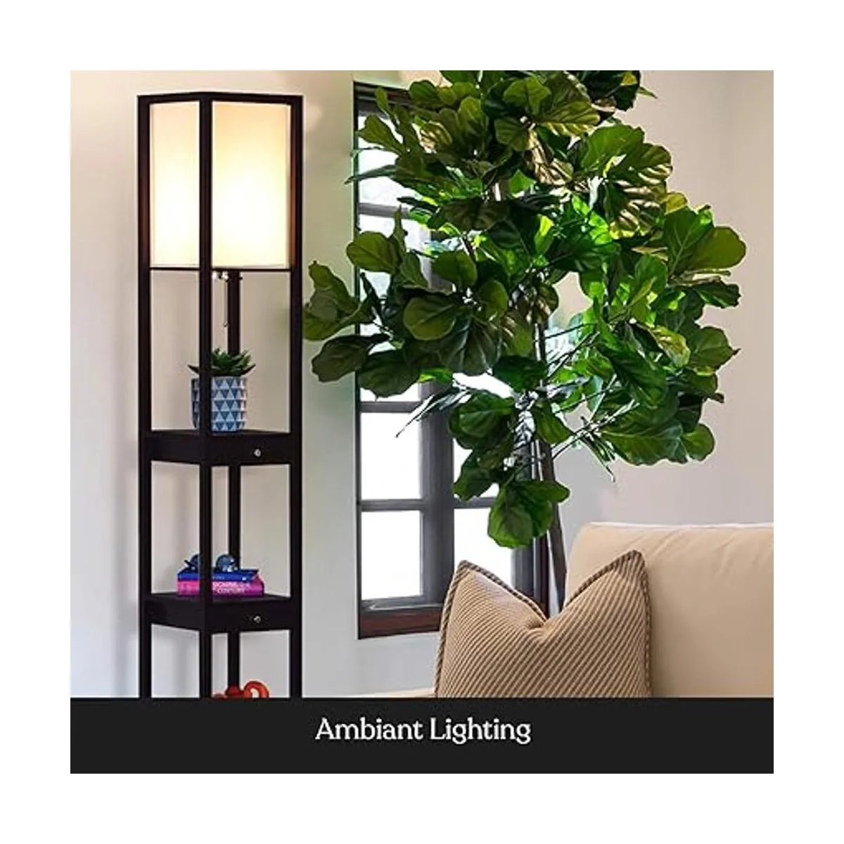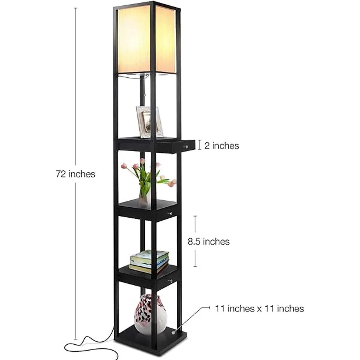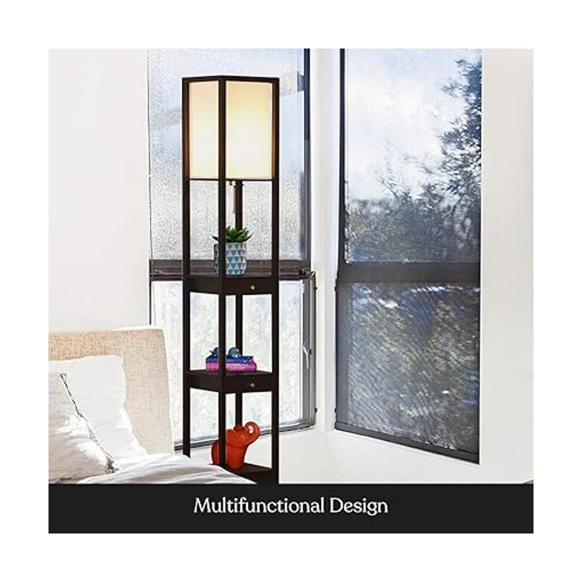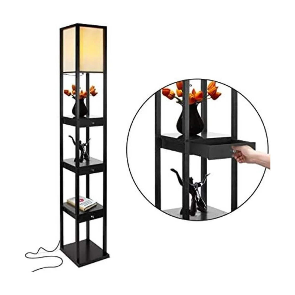 Tower Floor Lamp with a Drawer Book Shelf Combo: Brightech durable tall lamp has a stable structure and high loading that lends a soft ambient glow to contemporary spaces while providing a 4tiered display shelving for added convenience. Have multiple drawers by the bed for convenient and discreet storage, while displaying books, art, and plants on the shelves. Enjoy the convenience of Brightech floor lamps in your bedroom, living room, guest room, foyer, or office.