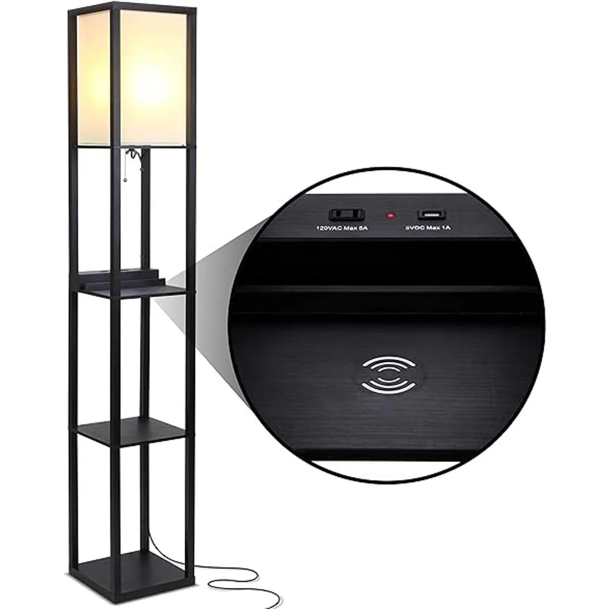 Brightech Maxwell Lámpara de pie moderna con puertos USB, estación de carga inalámbrica y toma de corriente, lámpara de pie con estantes para sala de estar y oficina, se adapta a mesitas de noche de dormitorio, color negro