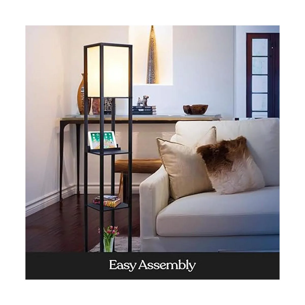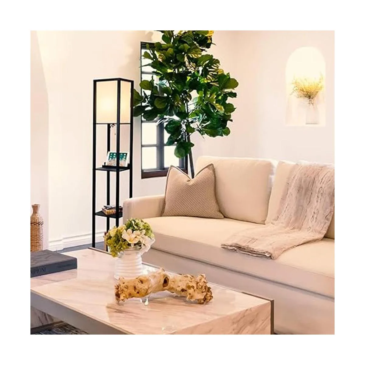 Decoración de sala de estar inspirada en Asia: esta lámpara moderna de estilo asiático es una combinación de una mesa con estanterías integradas y luz adjunta. La mesa auxiliar y la lámpara de pie que ahorra espacio tiene una capacidad de 50 libras. y funciona bien en habitaciones de invitados, habitaciones de niños, oficinas, dormitorios y otras áreas pequeñas. La mesita de noche es ideal para guardar libros para leer la hora de dormir, mientras que la lámpara alta crea un brillo cálido y brillante como la luz solar. Añade esta lámpara de pie a tu habitación para obtener brillo cuando la necesites.