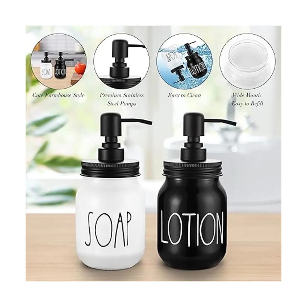 El relleno es muy fácil: la tapa de la bomba dispensadora de jabón Mason tiene una boca extra ancha que hace que rellenar los dispensadores de jabón de vidrio sea extremadamente fácil No más buscar botellas de plástico baratas o recambios desordenados, con este juego terminarás de rellenar en poco tiempo.