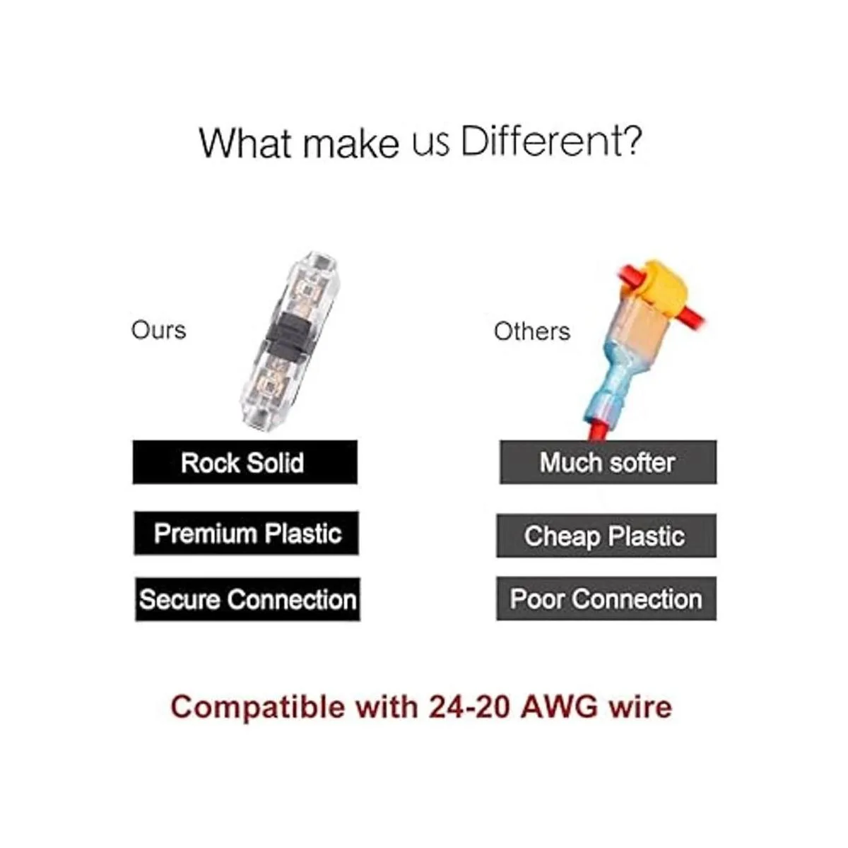 Conexión sólida de roca: los conectores de cable Brightfour resuelven el problema de aflojamiento causado por las diferentes temperaturas, etc. Después de algunas pruebas, verás que todavía se mantienen apretadas y mantienen un buen contacto. Destacan con una conexión segura fiable que otros tipos de conectores.