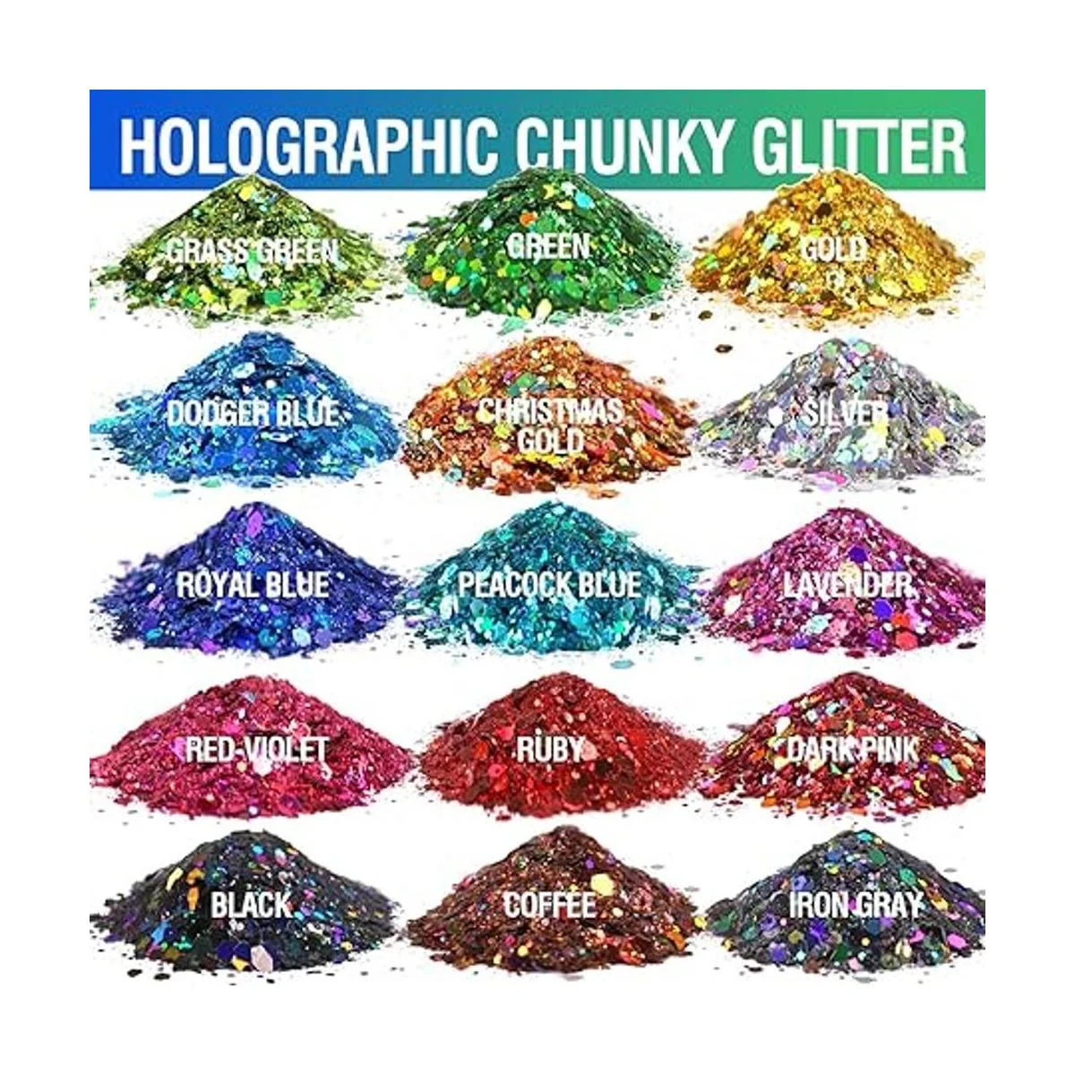 Colores holográficos únicos: juego de 15, alrededor de 0.35 oz/frasco, contiene 15 impresionantes colores holográficos: oro, oro de Navidad, plata, rubí, rojovioleta, lavanda, rosa oscuro, verde, verde hierba, azul real, azul pavo real, café, gris hierro y negro, ofrece un acabado metálico con un acabado arco iris secundario que te da un efecto deslumbrante, un artículo imprescindible para tu mesa de manualidades.