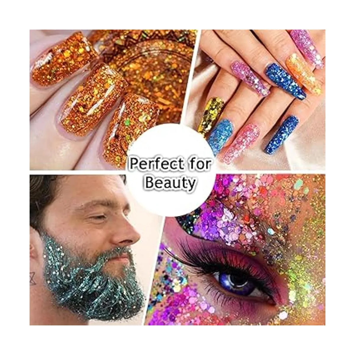 Brillo holográfico grueso: nuestras combinaciones de purpurina gruesa y purpurina fina, son brillantes y tienen varios tamaños de purpurina, lo que puede crear un encantador efecto de brillo en el sol y la luz para que destaques entre la multitud. Y conviértete en la próxima reina de la variedad en fiestas, bailes, bailes de máscaras y festivales de música.