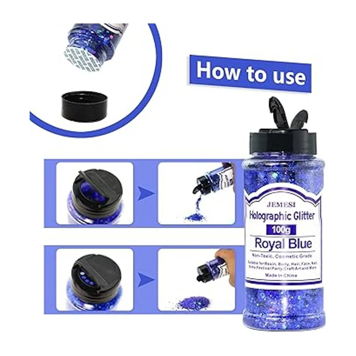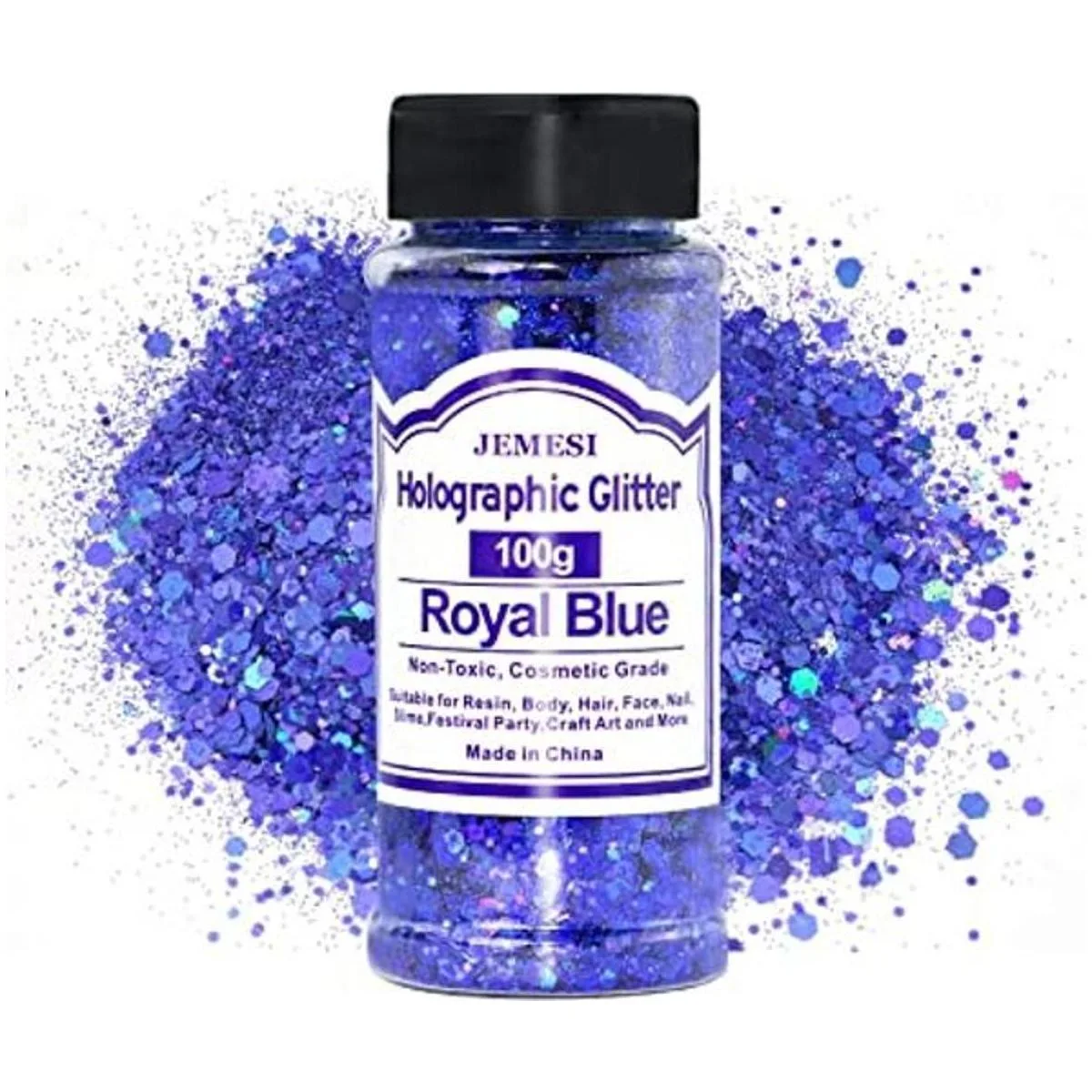 Brillo holográfico grueso, 3.53 oz, color azul real, purpurina cosmética para manualidades de resina epoxi, lentejuelas de uñas, copos iridiscentes, cuerpo, cara, cabello, uñas, fabricación de limo con purpurina