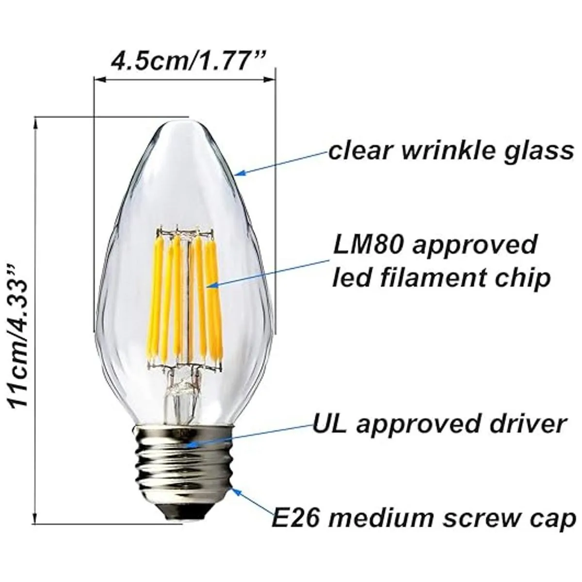 Especificaciones completas: bombillas LED regulables para candelabro F15, base mediana estándar E26, 8 W para reemplazar bombillas incandescentes antiguas de 80 W o 75 W. Entrada de CA 110 V/120 V/130 V, crecimiento suave de 2700 K, ángulo de haz de 360, diseño LED de filamento, aspecto vintage, ideal para actualizar el accesorio de iluminación colgante basado en candelabro E26.