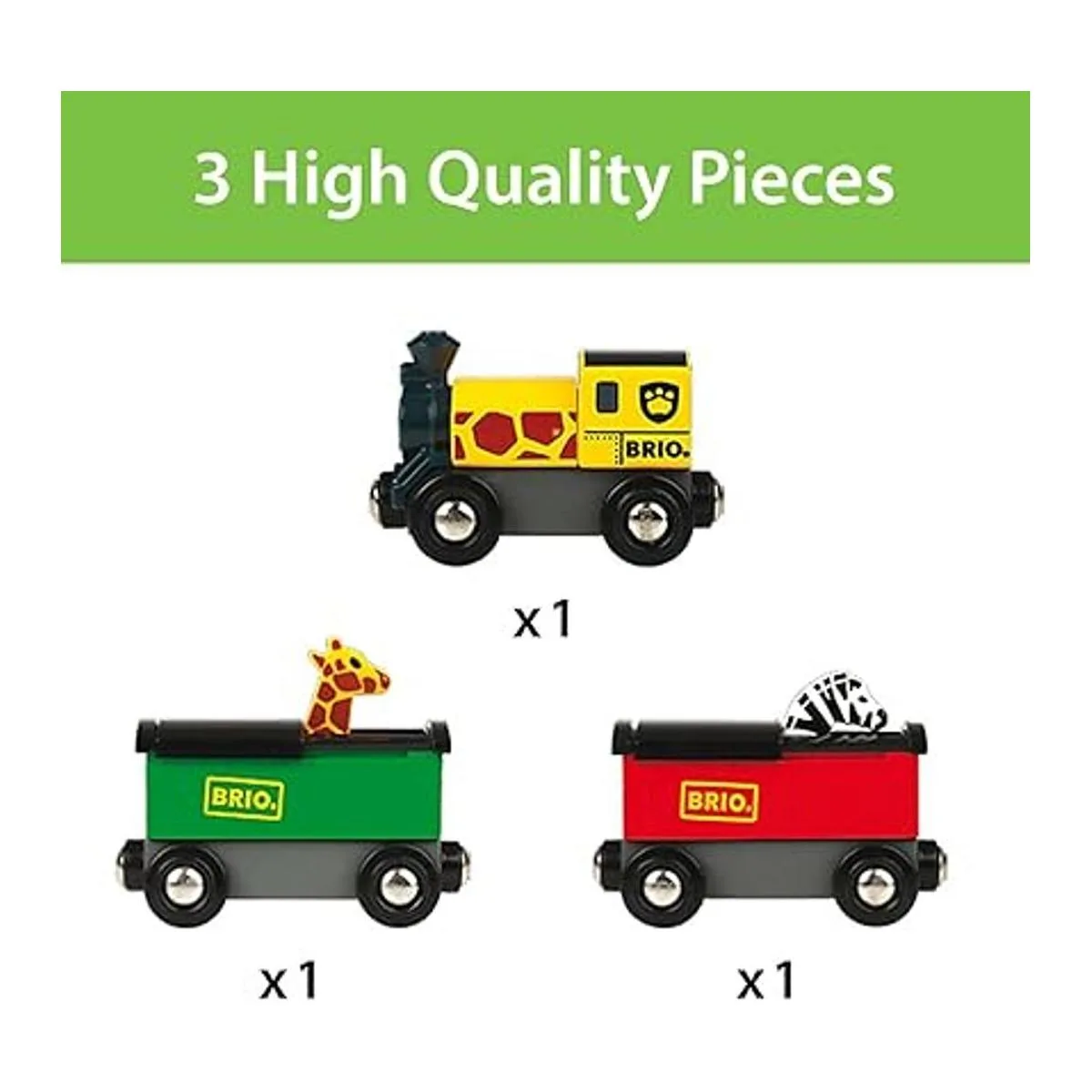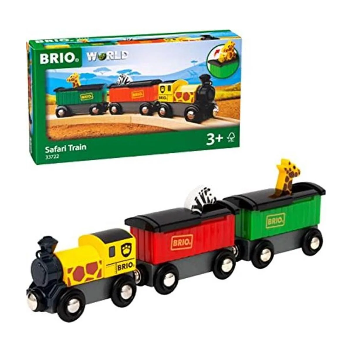Product includes The Safari Train comes with 3 train cars, including a uniquely decorated safari engine and two wagons with giraffe and zebra inside.