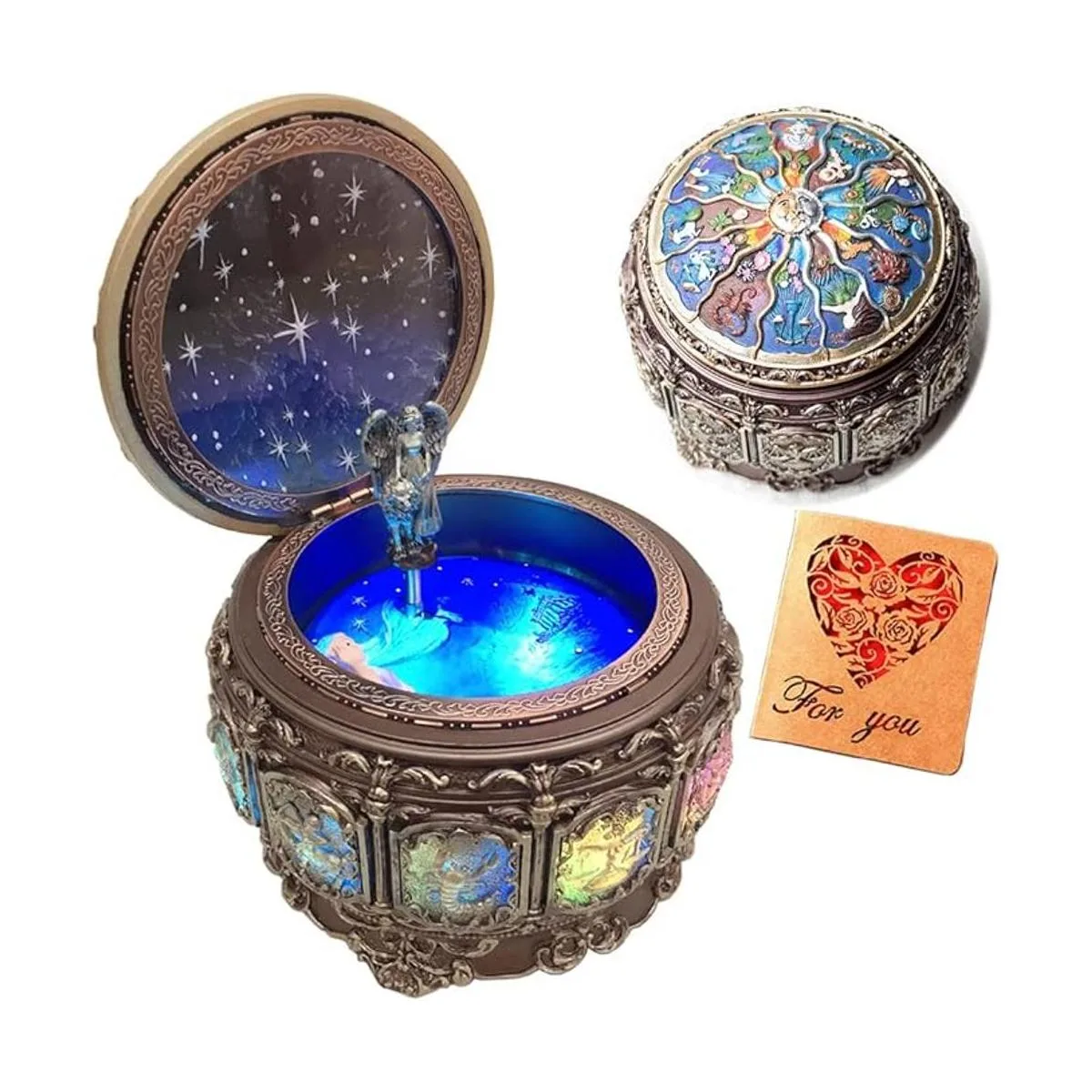 Briskfeel Caja de música vintage con constelaciones, luces LED de diosa giratorias, mecanismo tallado de resina centelleante, caja musical con Sankyo de 18 notas, signos de cuerda del zodiaco, regalo para cumpleaños actualizado