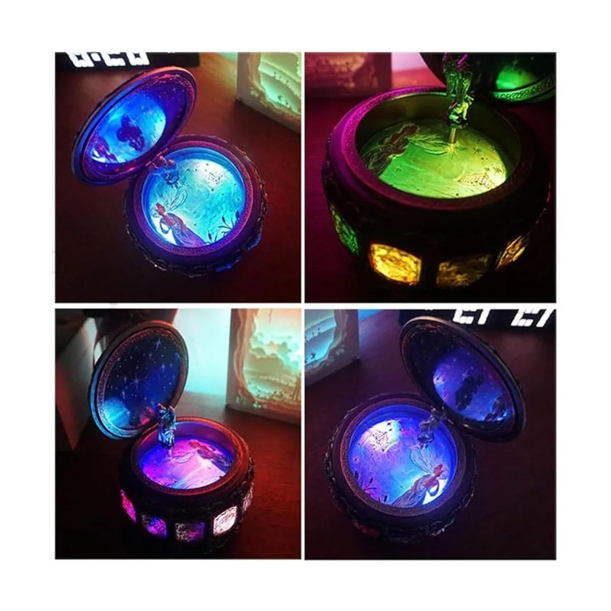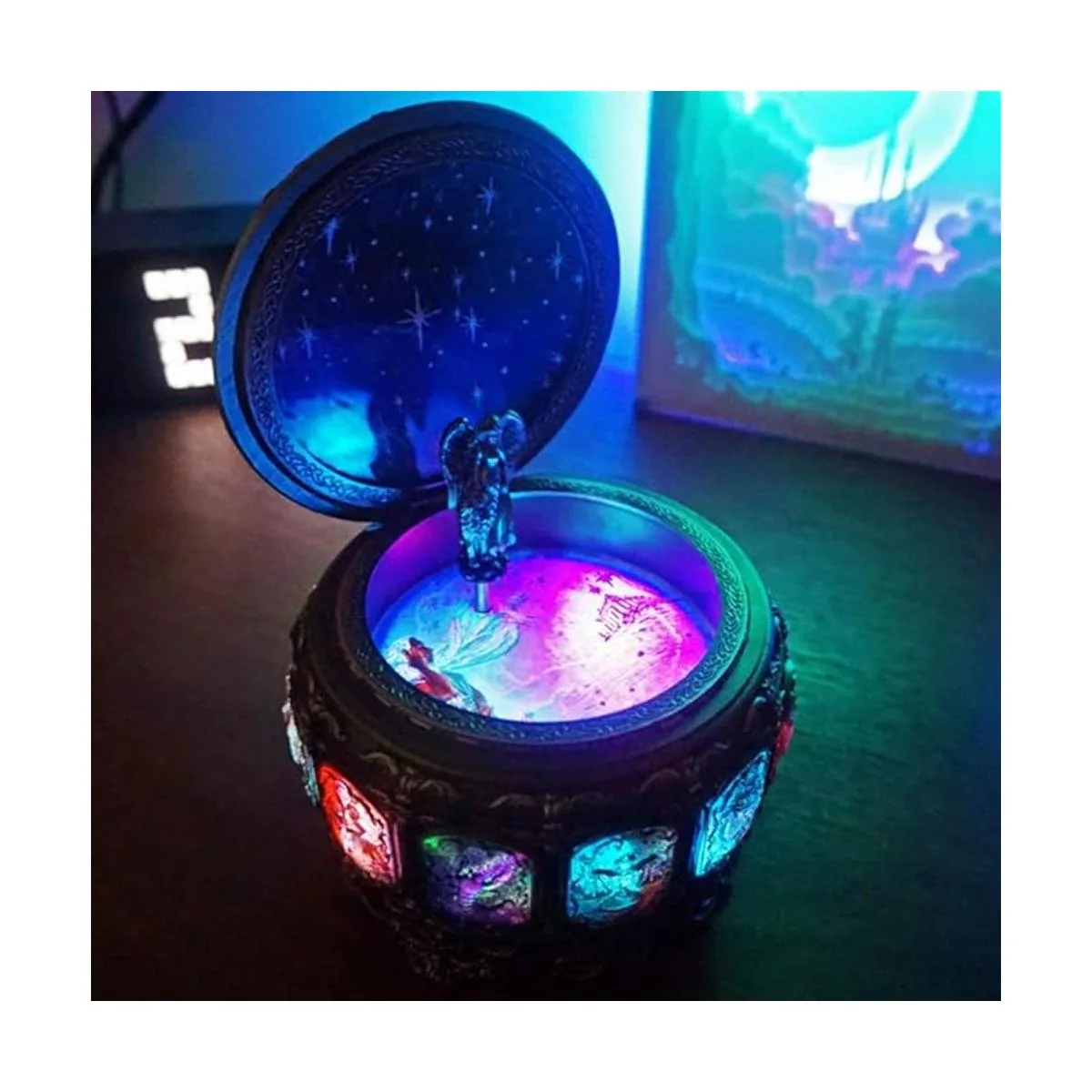 Las luces LED coloridas parpadearán junto con la música. Cuando la música está apagada, las luces se apagarán. La diosa girará cuando la música esté encendida.
