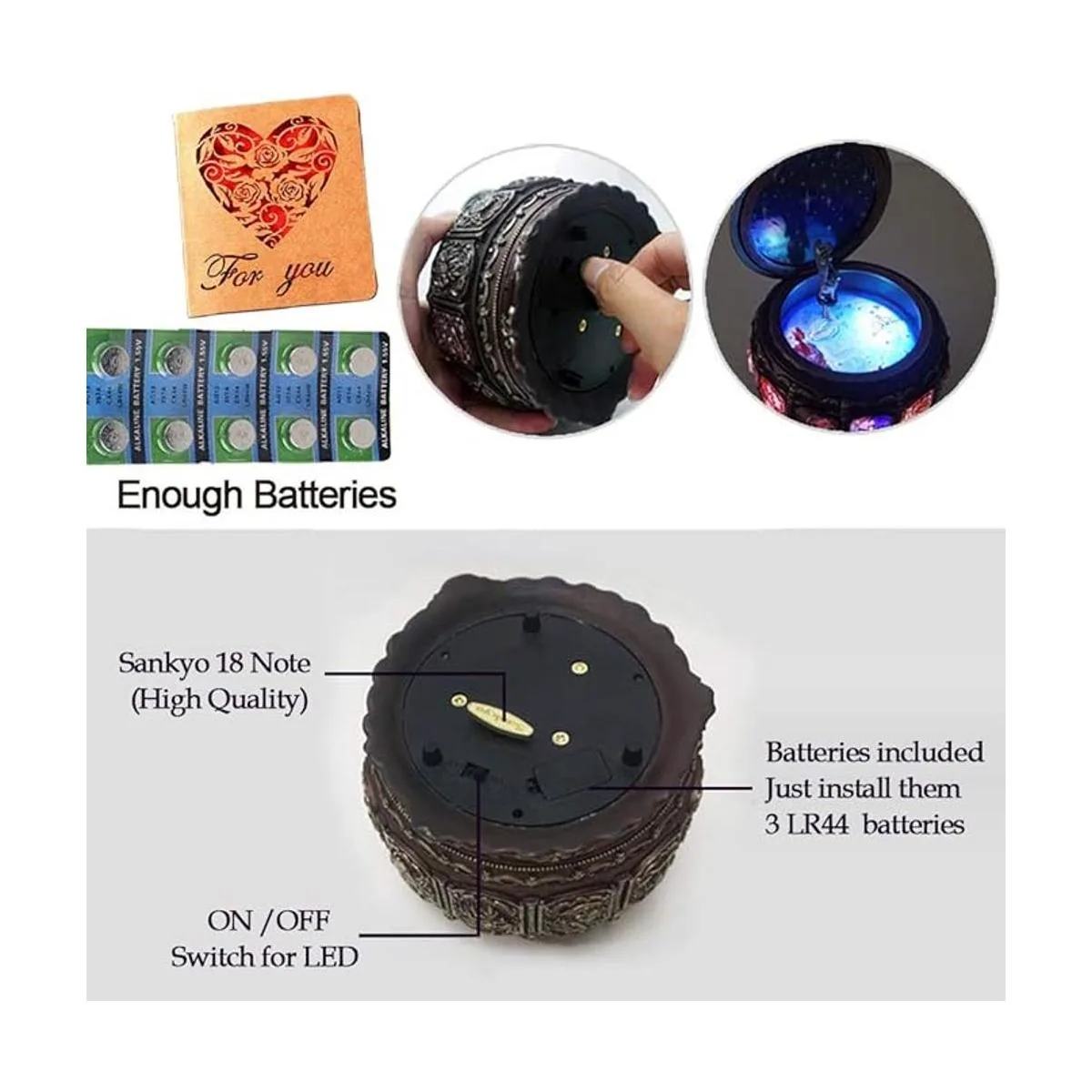 Esta caja de música es mejorada y retro para niños y adultos. Reproduce la melodía inspiradora de Always with Me, movimiento de 18 notas. Necesitas darle cuerda al movimiento para reproducir música.