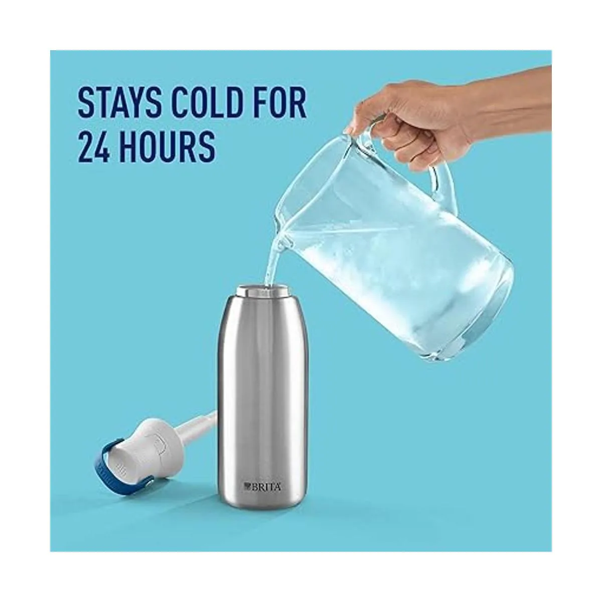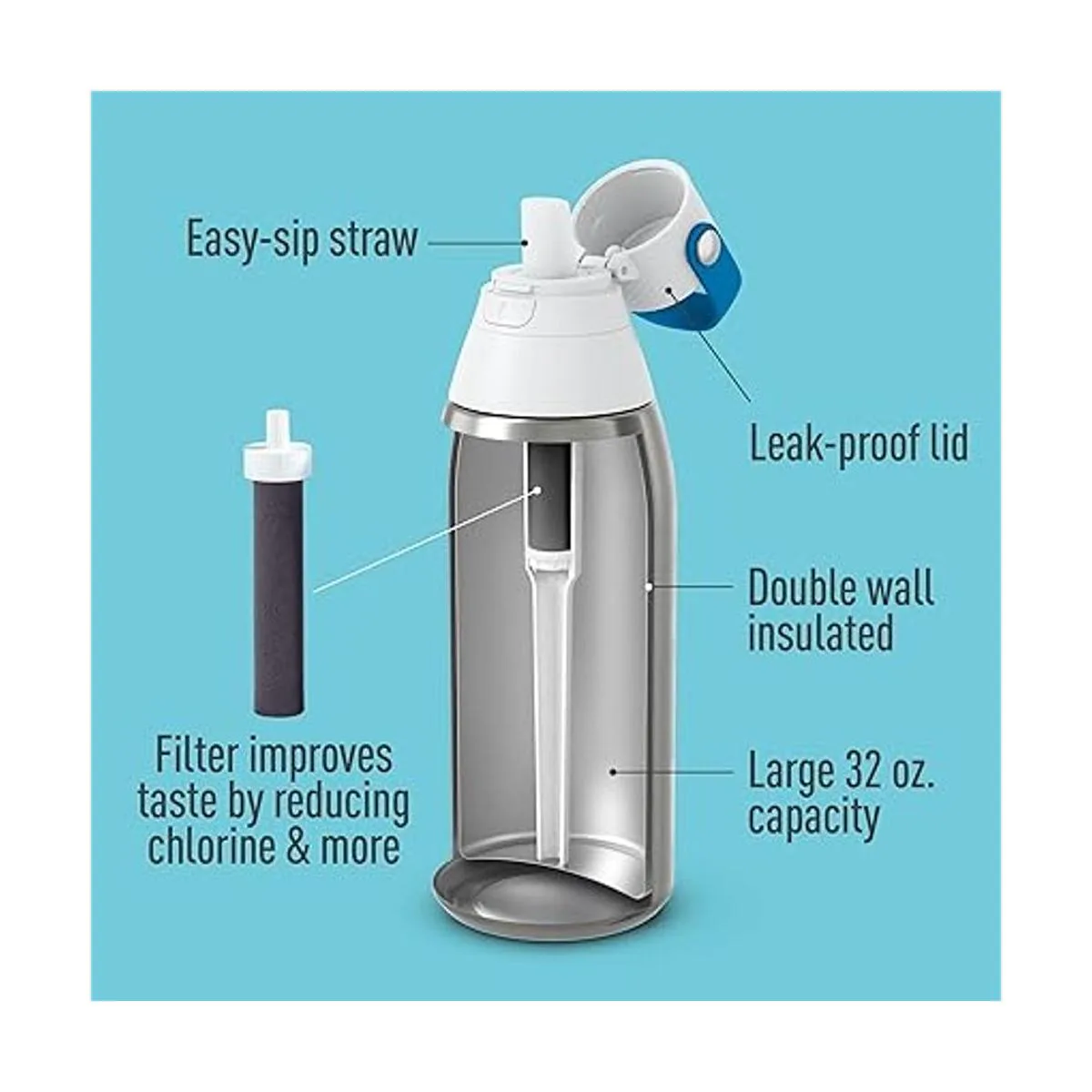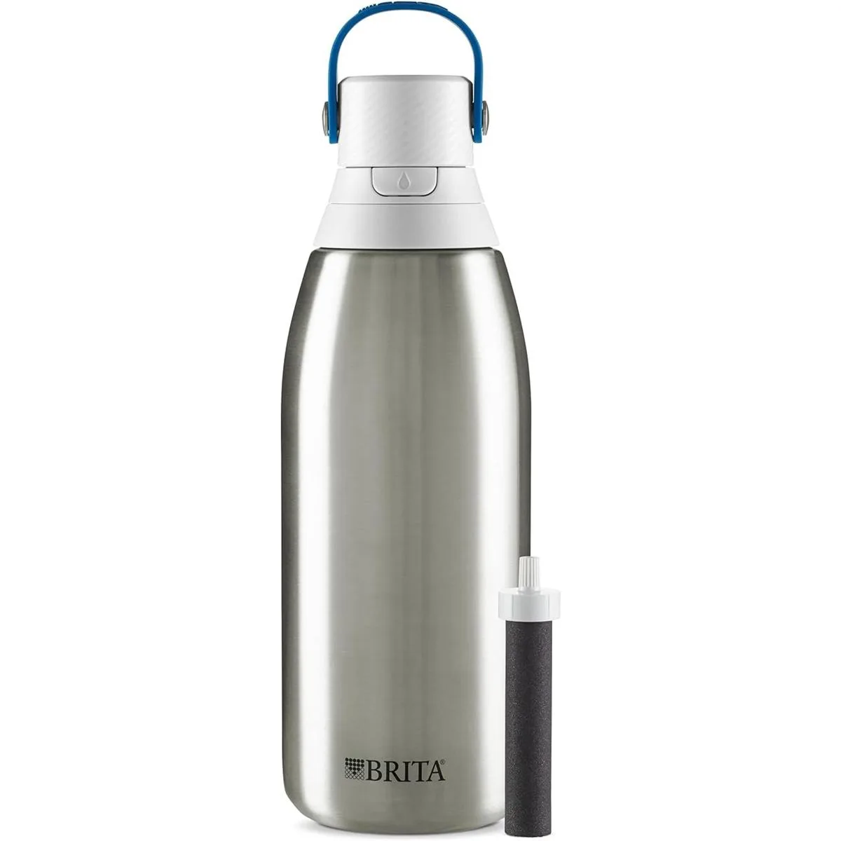 Brita La botella de acero inoxidable de filtrado premium tiene capacidad para 32 onzas de agua, y está diseñada con un filtro Brita que cabe en el popote que hace que el agua tenga un gran sabor y mantiene el agua fría durante 24 horas