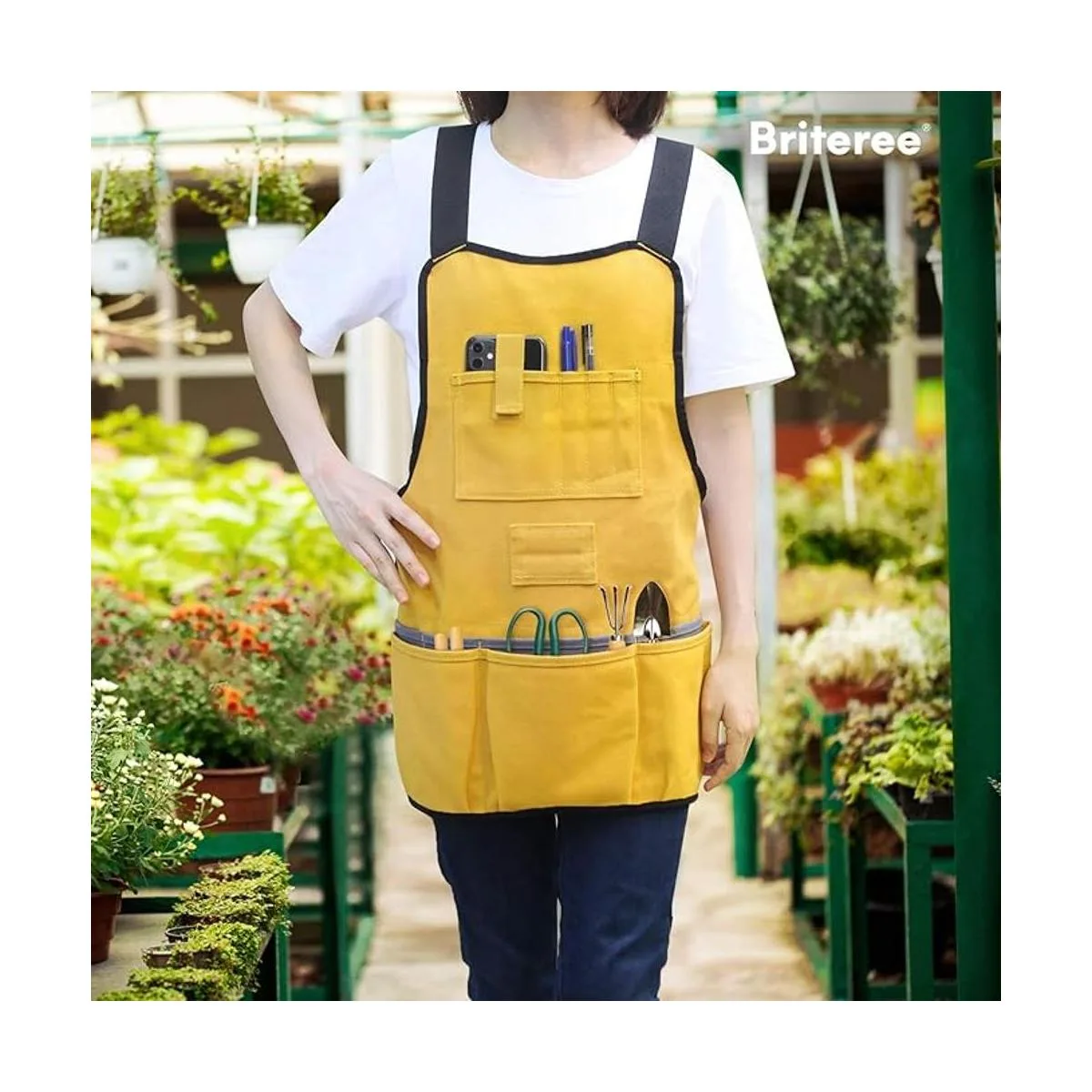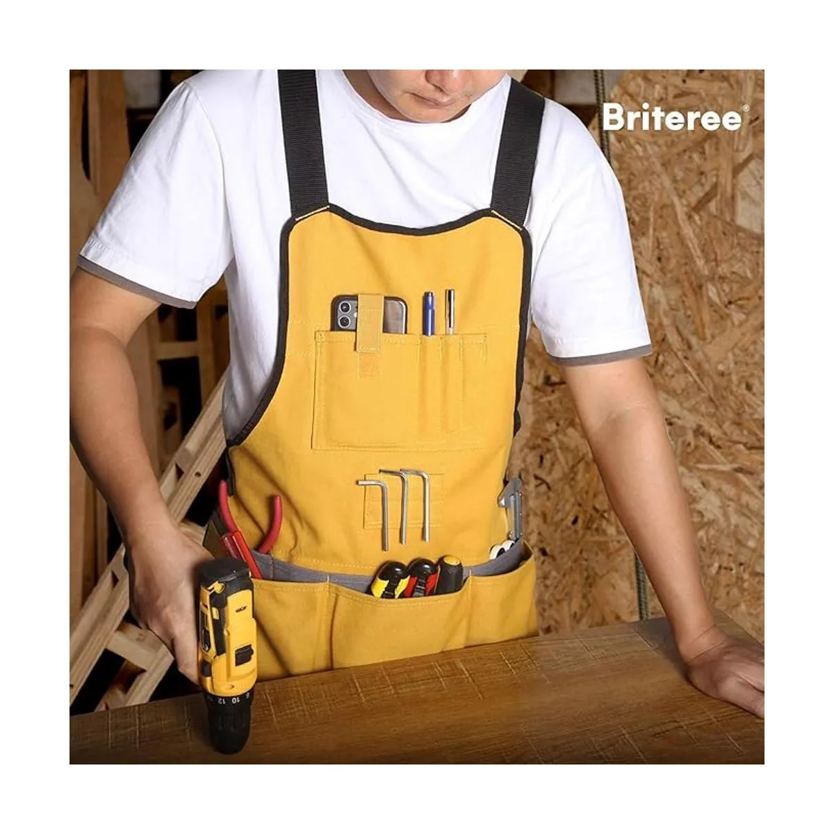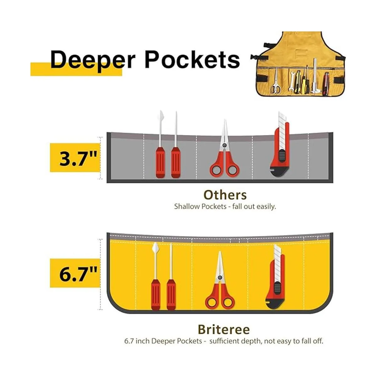 Bolsillos más profundos: el delantal de carpintero Briteree viene con bolsillos espaciosos de 6.7 pulgadas de profundidad, además de añadir una correa elástica en el bolsillo del teléfono celular para evitar aún más que tus artículos se caigan cuando se agachan.