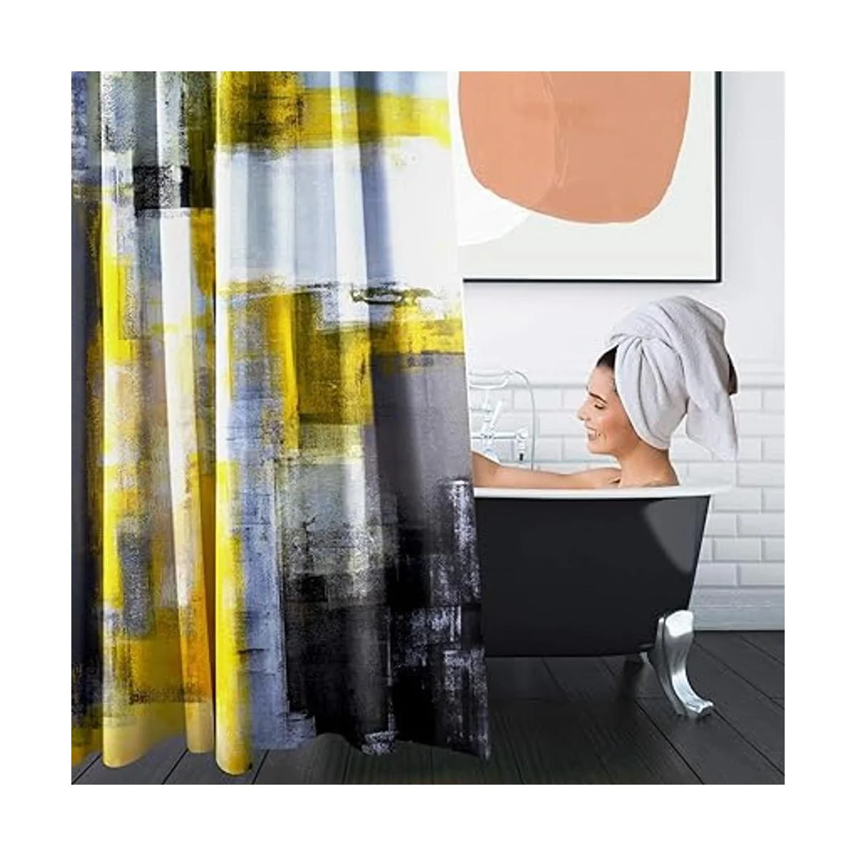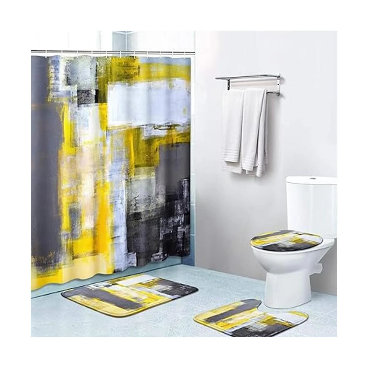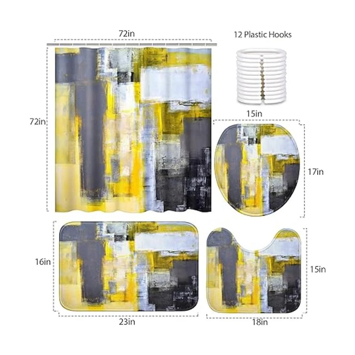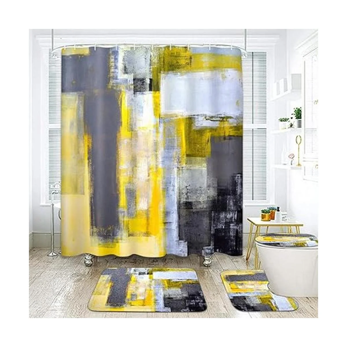 Britimes Juego de 4 cortinas de ducha, color amarillo gris y blanco con alfombras antideslizantes, cubierta de tapa de inodoro y tapete de baño, duradero e impermeable, para juego de decoración de baño, 72 x 72 pulgadas