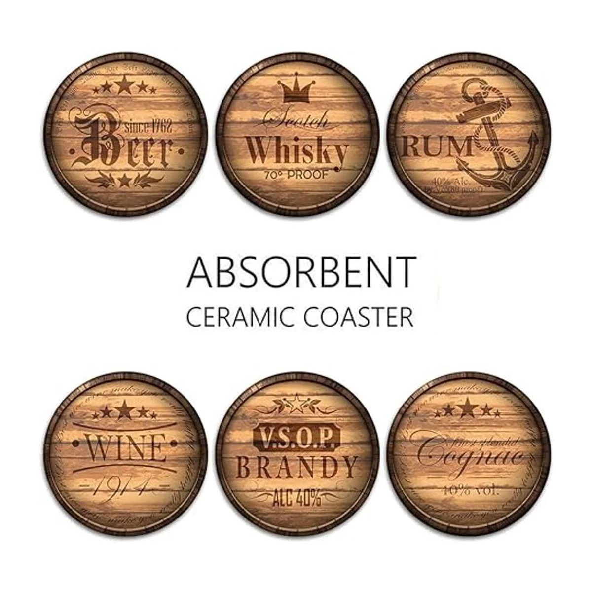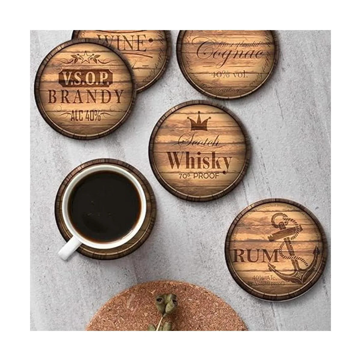 Britimes Juego de 6 posavasos para bebidas absorbentes con base de corcho, soporte de metal, alfombrilla redonda de madera para mesa de madera de café, regalo para cumpleaños, decoración de casa de campo, bar, retro 2