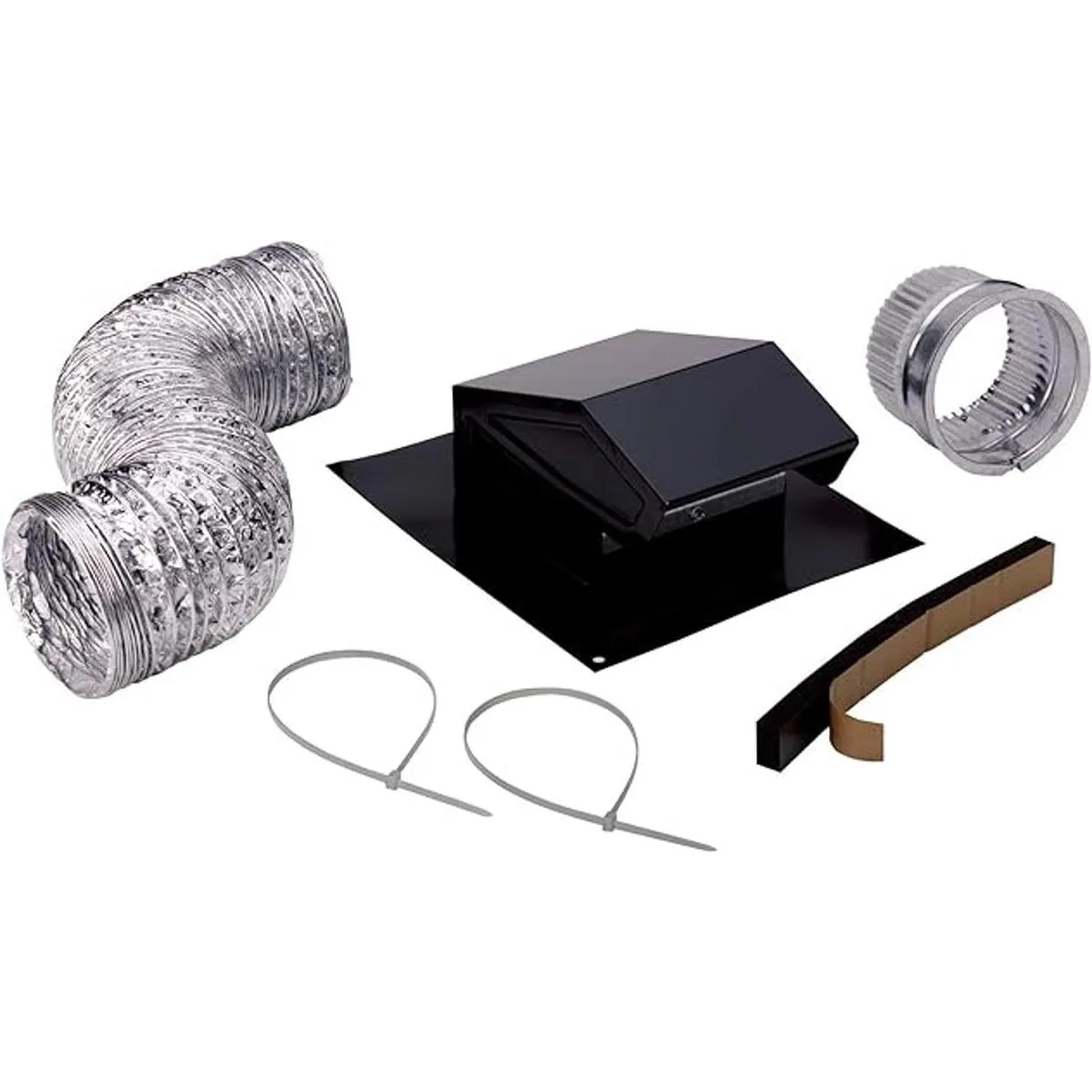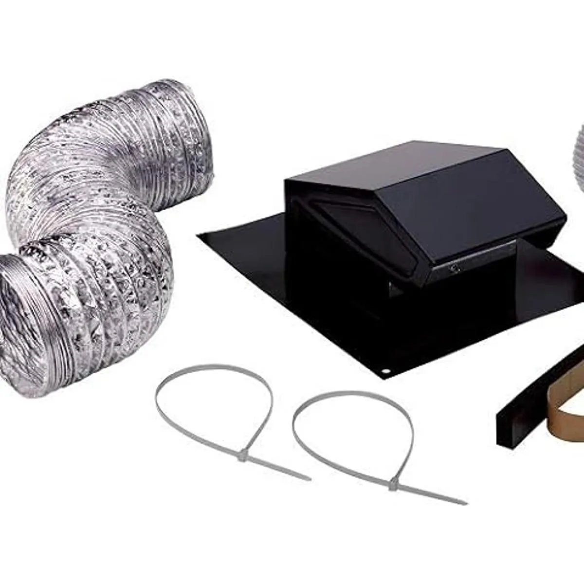 Incluye 8 pies de laminación metálica flexible de 2 capas, conector de conducto de metal de 4 pulgadas de diámetro, 2 abrazaderas de conducto, reductor de 4 a 3 pulgadas y tapa de techo modelo 636
