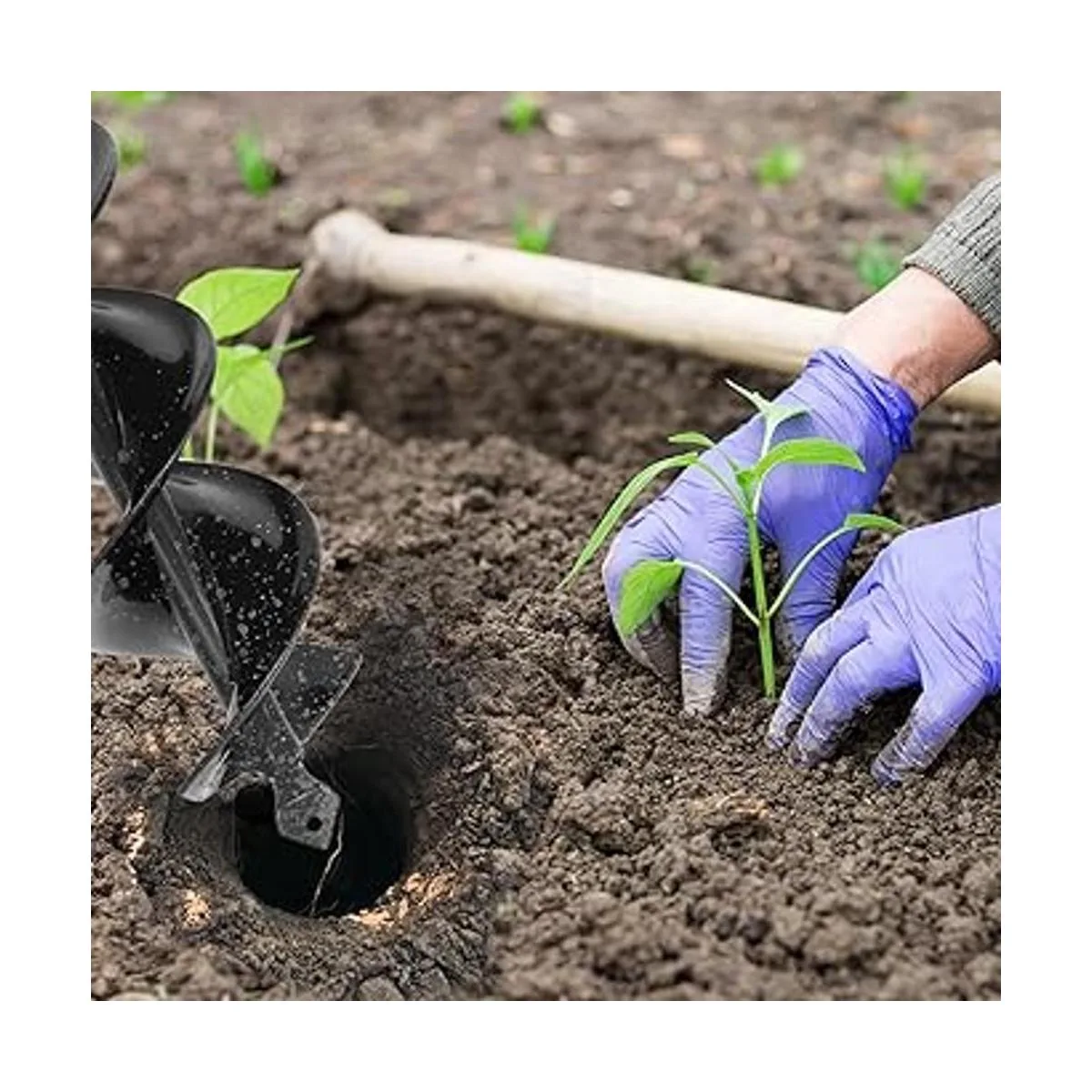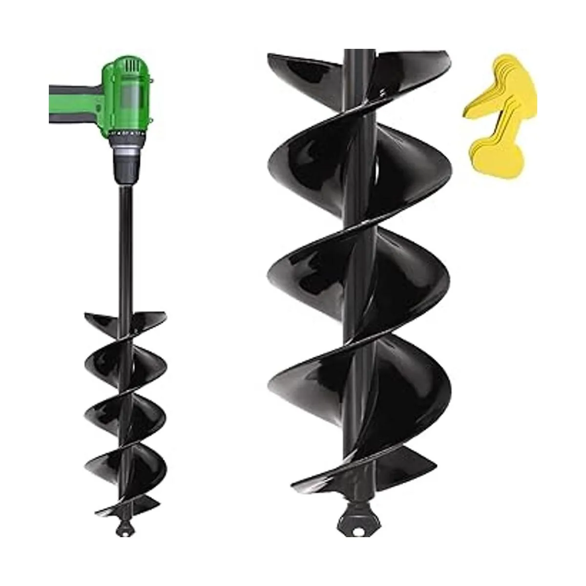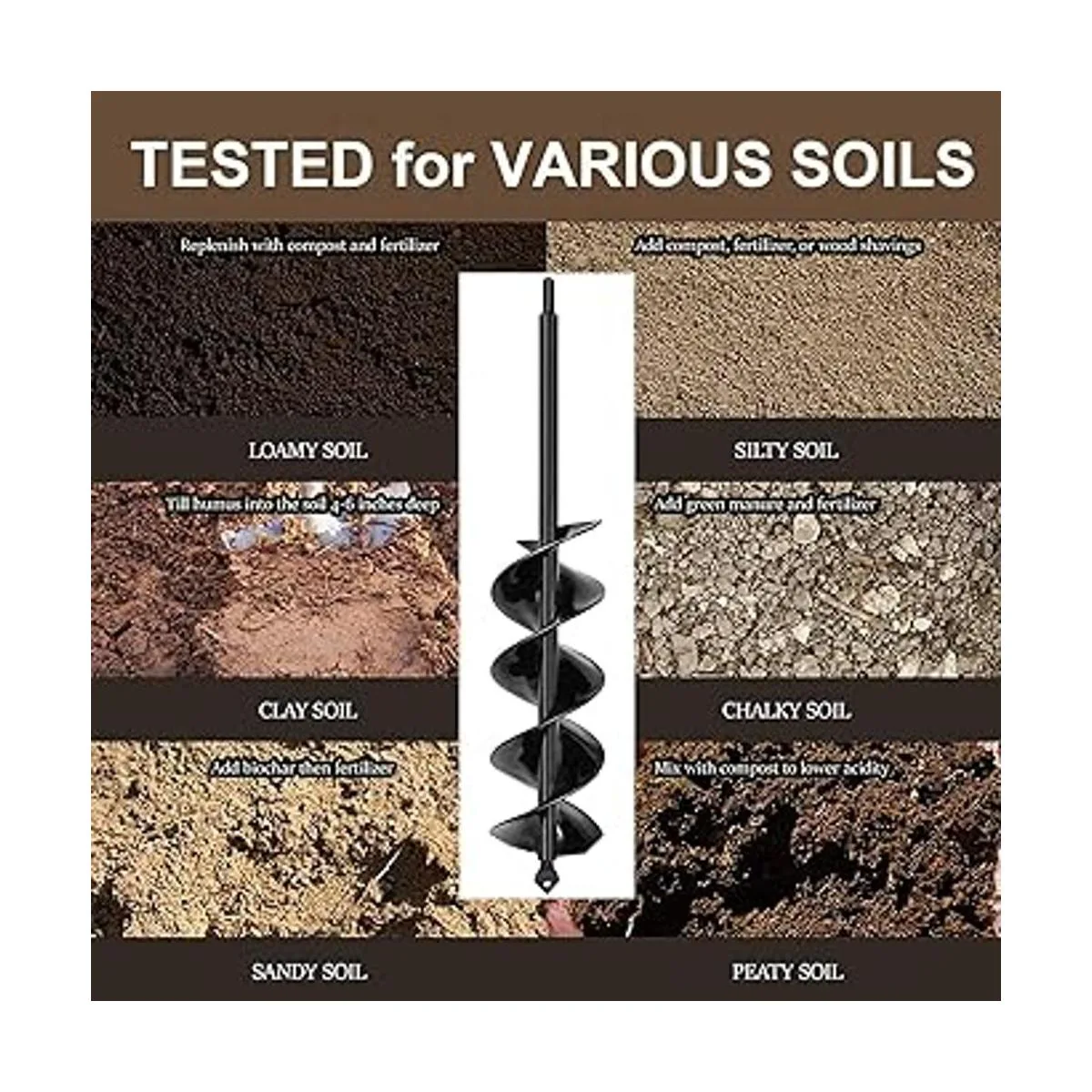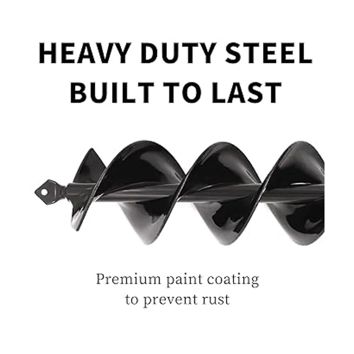 Diseñadas para durar: Hecha de acero aleado resistente, con acabado pintado en negro brillante. El punto de broca de taladro mejorado golpea primero el suelo y lo mantiene estable cuando está cavando suelos duros. Nuestra broca patentada de doble hoja y cuerpo sólido es la única en el mercado, hacemos que la distancia entre el inicio de la hoja de excavación y la punta sea mínima, y nuestro diseño sólido también es para cualquier tipo de tierra, y no tendrás miedo de las piedras al taladrar, por lo que nuestra broca sólida te ayudará