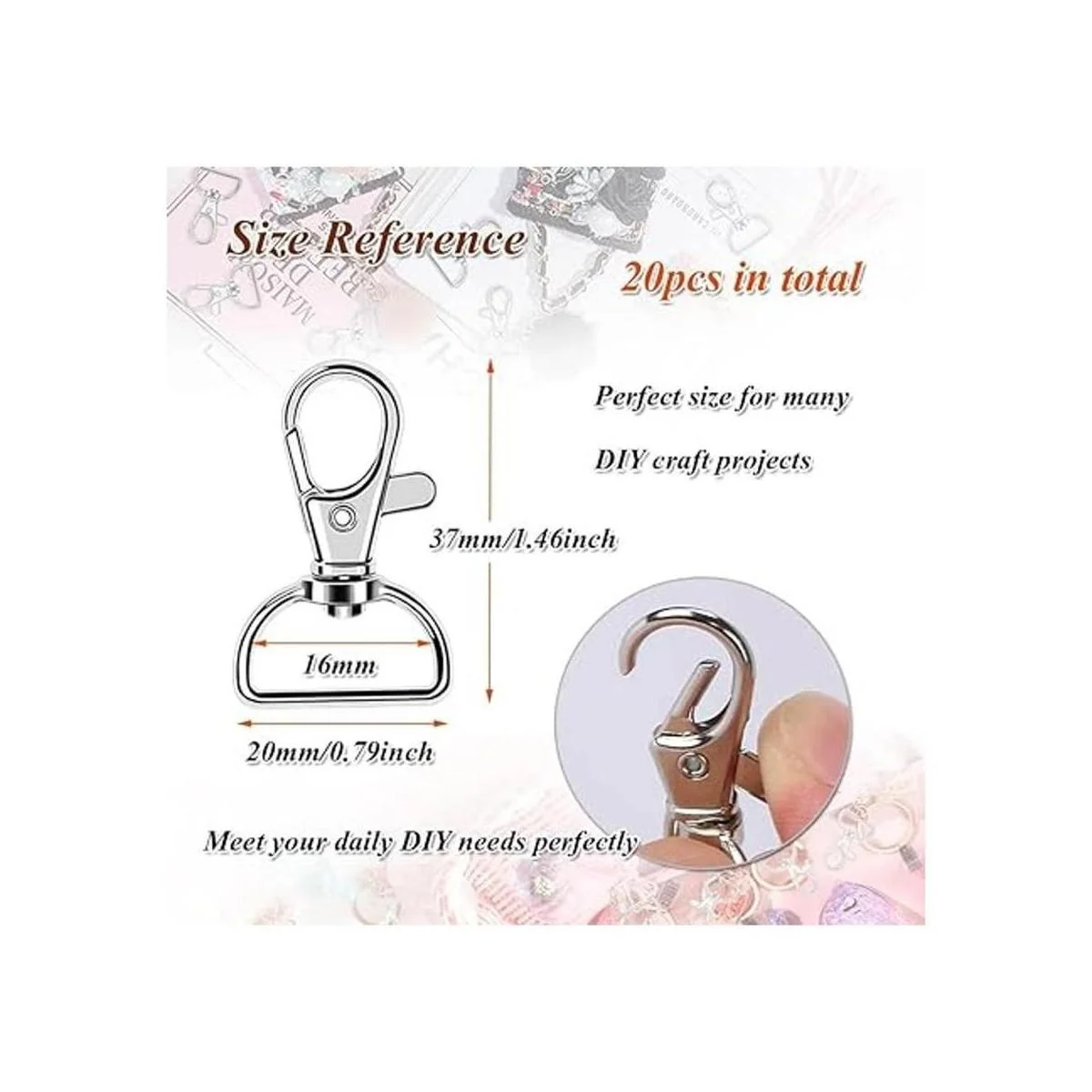 Tamaño perfecto y color clásico: este gancho de clip para llavero es de 1 1/2 pulgadas de largo con un anillo en D de 3/4 pulgadas de ancho, tamaño perfecto para muchos proyectos de manualidades, el clásico color plateado hace que coincida con muchos proyectos de arte de fabricación de joyas, satisface tus necesidades diarias de bricolaje perfectamente