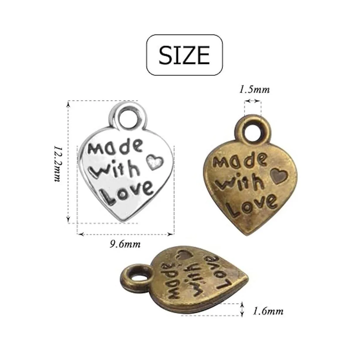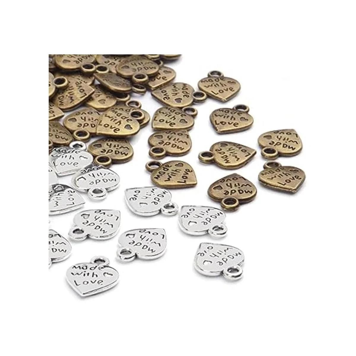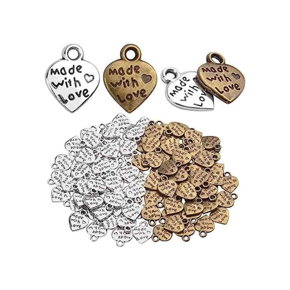 BronaGrand 100 colgantes con forma de corazón de melocotón Hecho con amor para hacer joyas de bricolaje plata antigua y bronce, Metal Plata