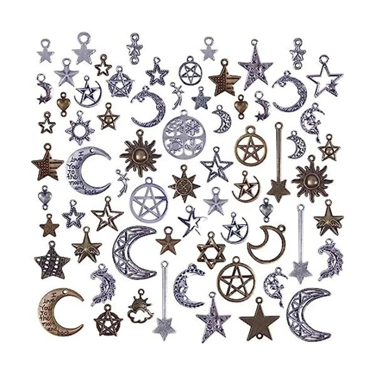 BronaGrand 3.53 oz aproximadamente 73 piezas mixtos de sol, luna, estrella, dijes celestiales antiguos para pulseras, collares, manualidades y joyería, varios colores