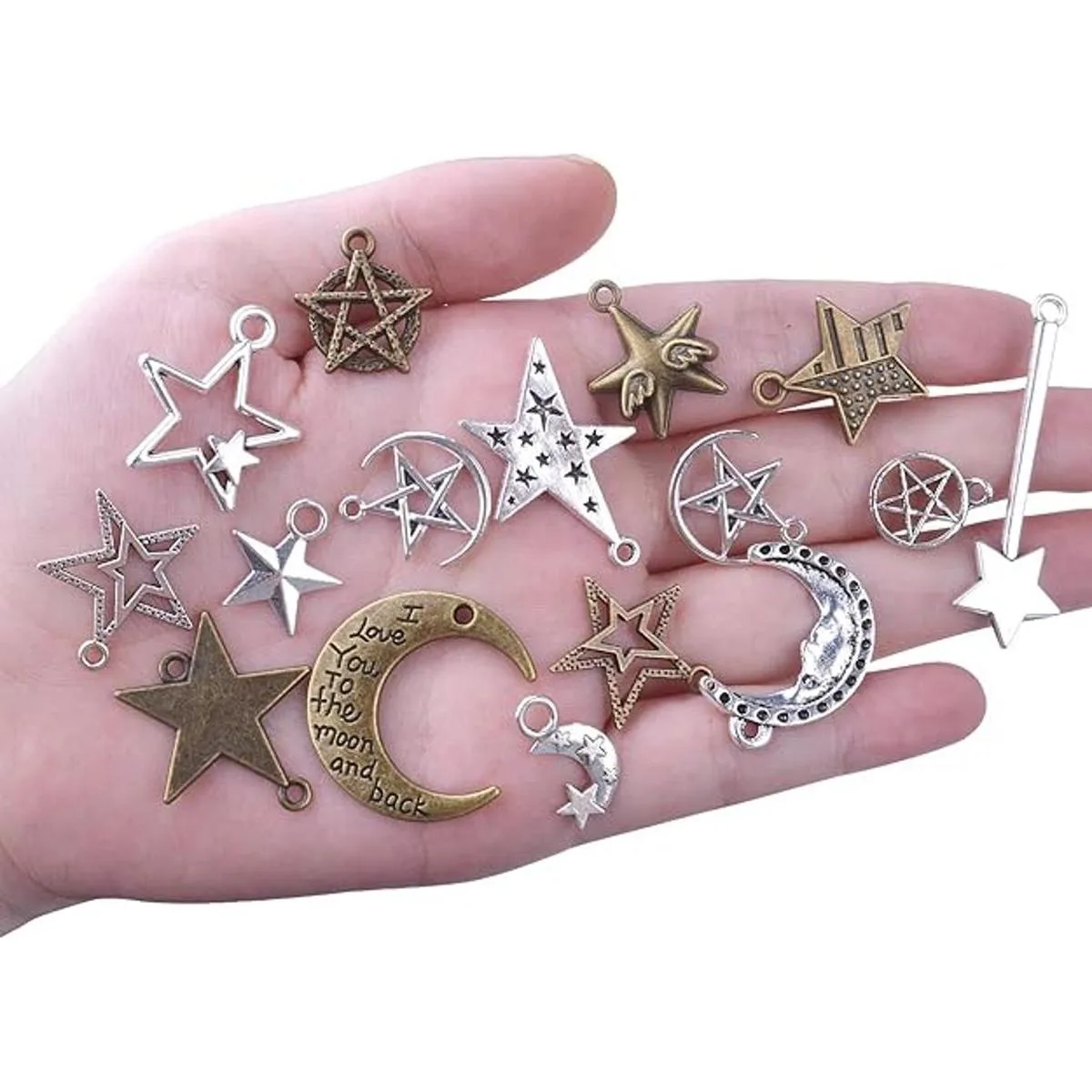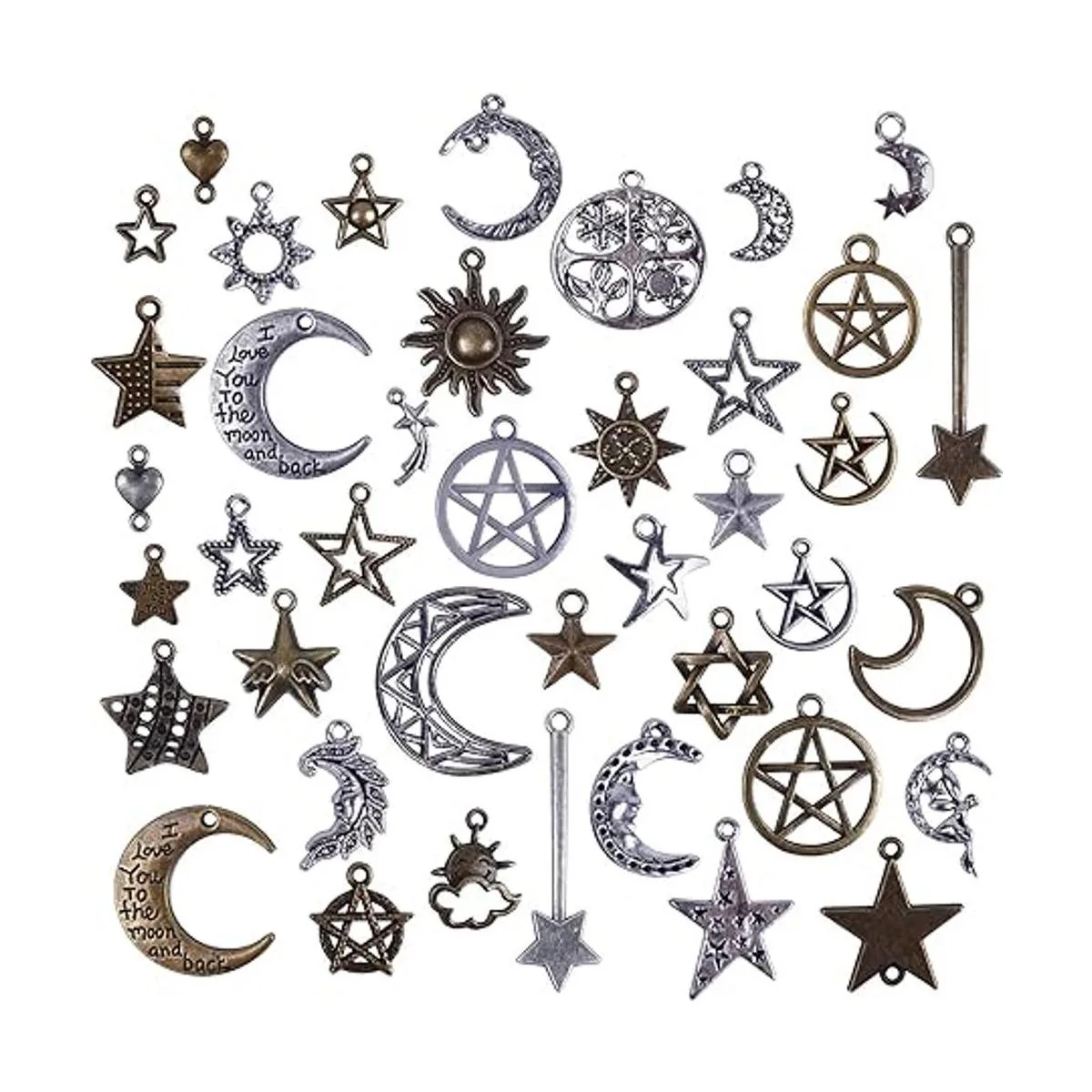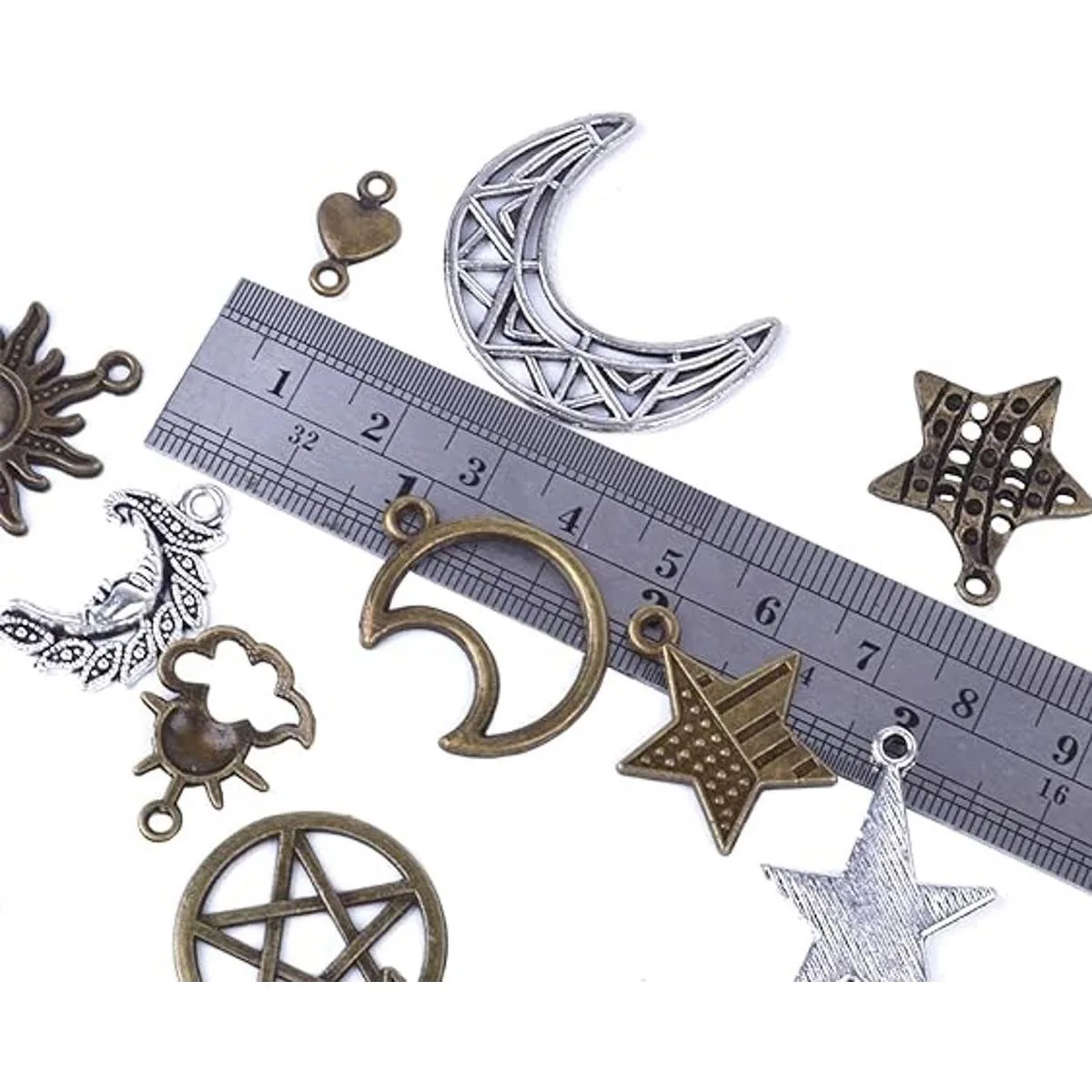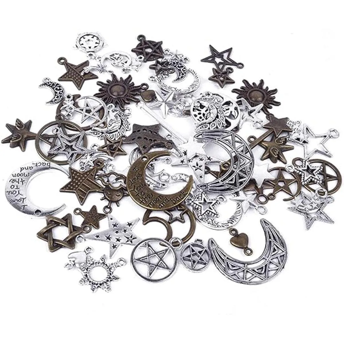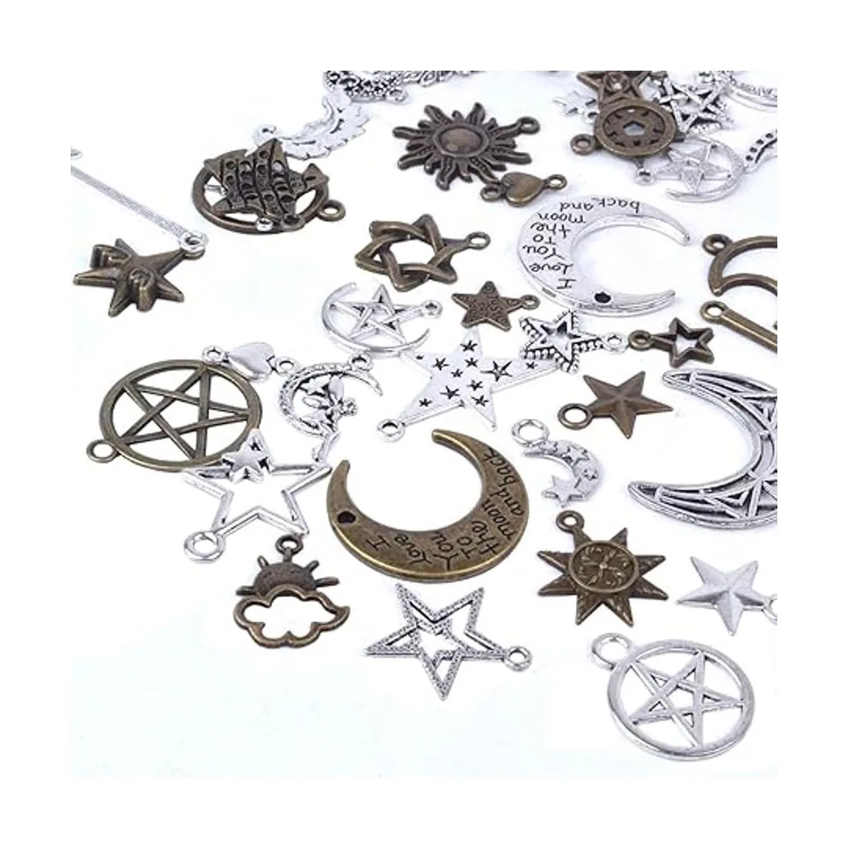 BronaGrand 3.53 oz (aproximadamente 73 piezas) mixtos de sol, luna, estrella, dijes celestiales antiguos para pulseras, collares, manualidades y joyería, varios colores