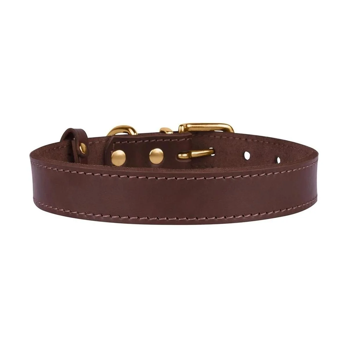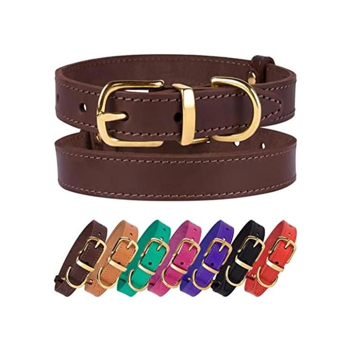 BronzeDog Collar de cuero para perro con hebilla duradera para perros pequeños, medianos y grandes, cachorros, gatos, gatos, rojo, rosa, morado, verde, marrón, negro tamaño de cuello de 17 a 21 pulgadas, marrón oscuro