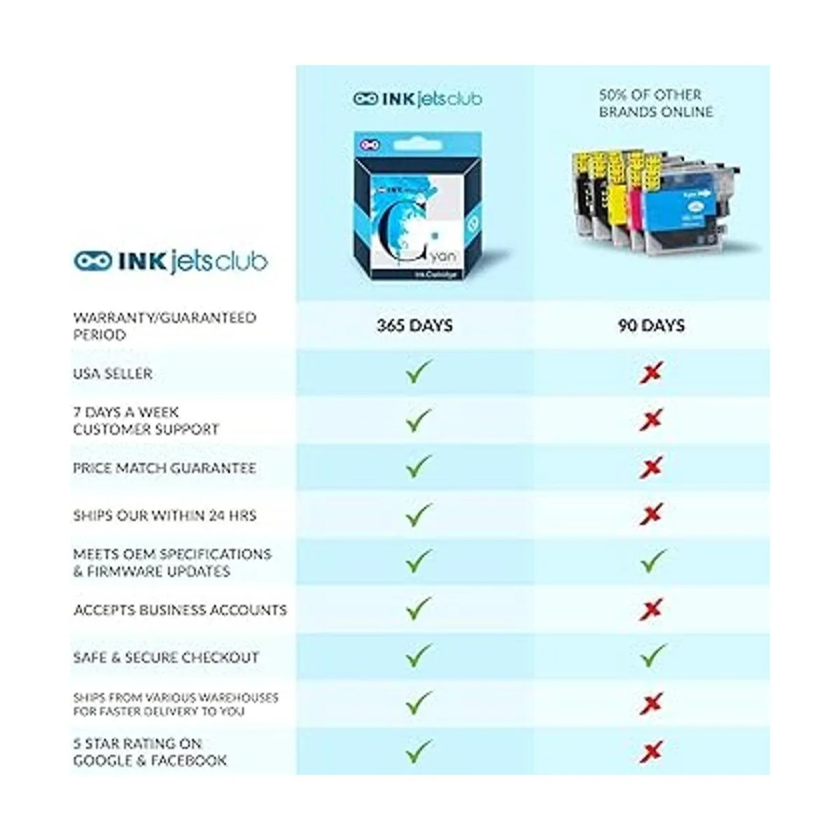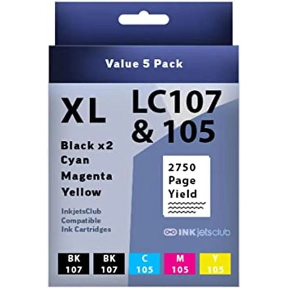 Brother LC107 105 Cartucho de tinta de alto rendimiento InkjetsClub cartucho de tinta de repuesto paquete de 5 unidades. Incluye 2 cartuchos de tinta negros, 1 cian, 1 magenta y 1 amarillo compatibles