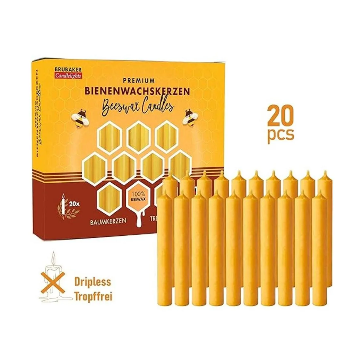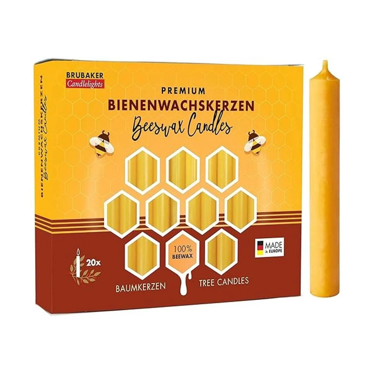 BRUBAKER Velas de árbol 100 cera de abeja, paquete de 20 unidades, color miel, 3.7 x 0.5 in, fabricadas en Europa, pirámides, carruseles y campanillas