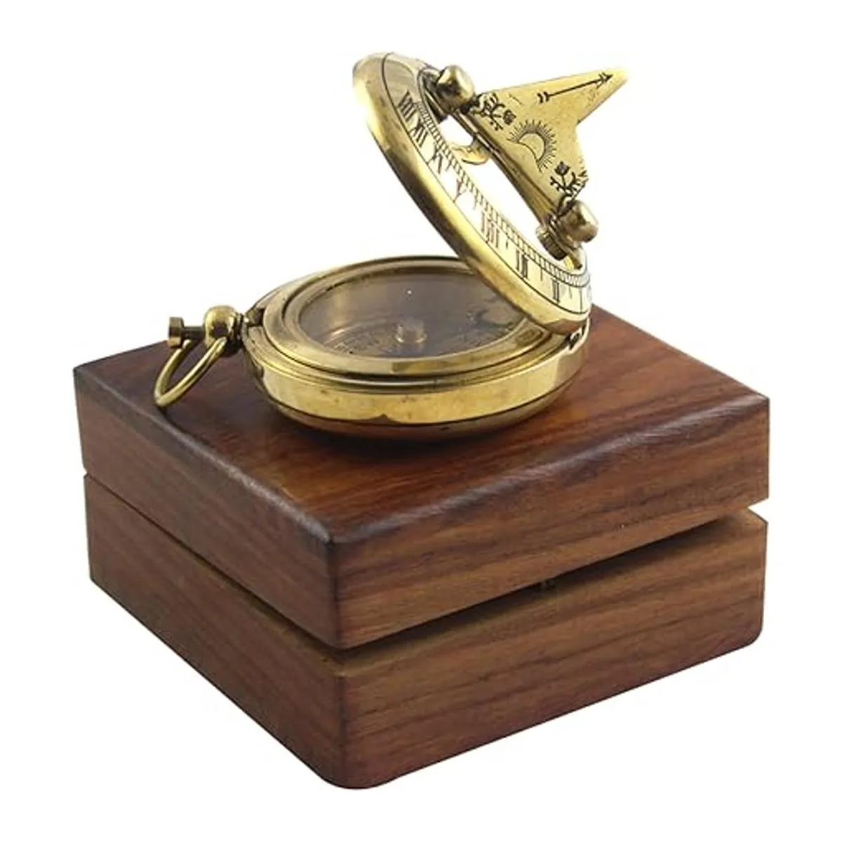 Brújula de latón brillante y caja de madera marrón antiguo, fabricada con material de latón y madera, caja: sí, pulido con acabado de latón y caja marrón.